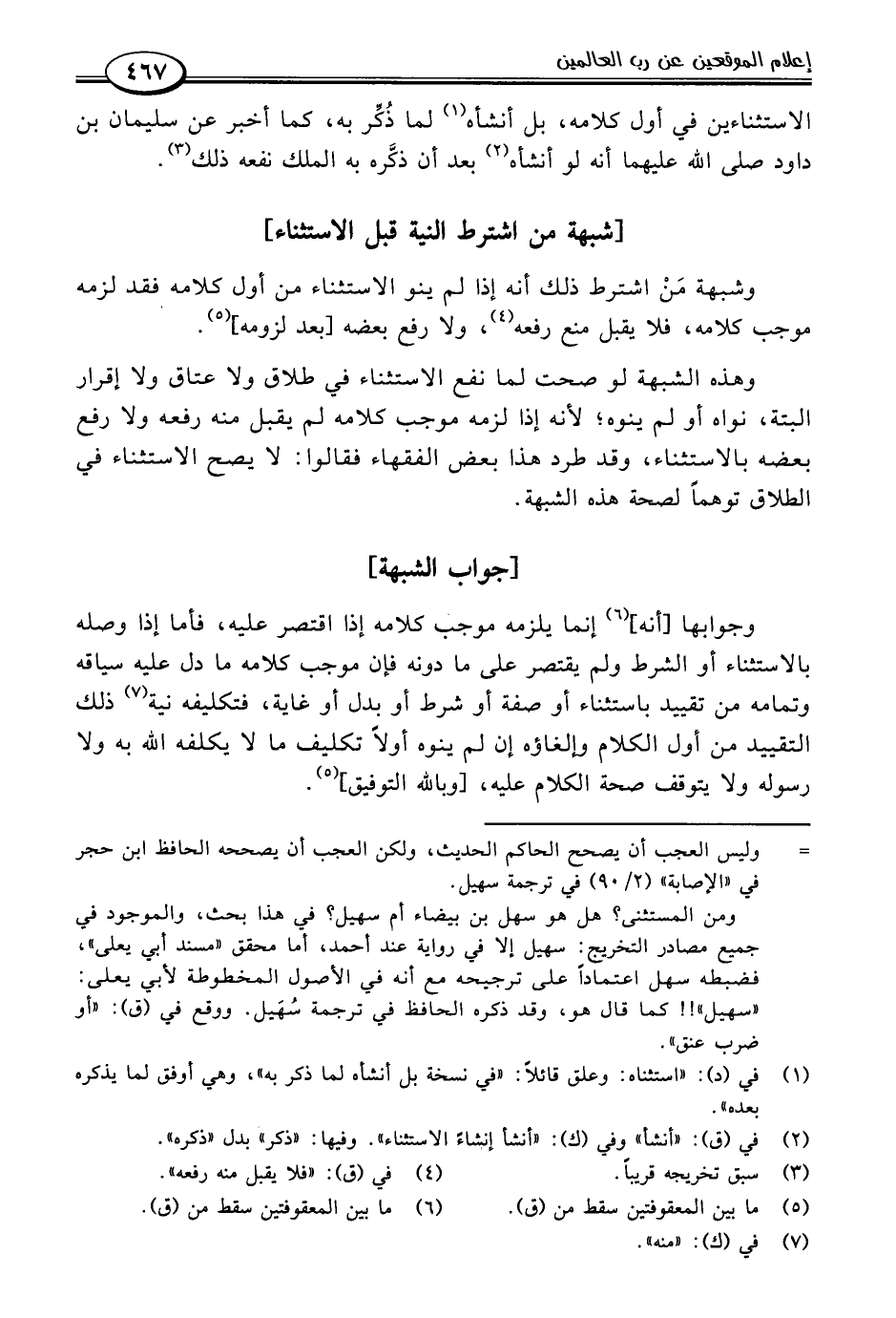 وهذه الشبهة لو صحت لما نفع الاستثناء في طلاق ولا عتاق ولا إقرار البتة، نواه أو لم ينوه؛ لأنه إذا لزمه موجب كلامه لم يقبل منه رفعه ولا رفع بعضه بالاستثناء، وقد طرد هذا بعض الفقهاء فقالوا: لا يصح الاستثناء في الطلاق توهمًا لصحة هذه الشبهة.