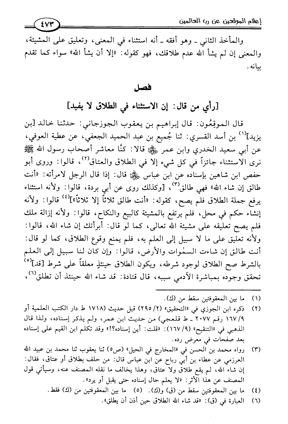 قال الموقِعُون: قال إبراهيم بن يعقوب الجوزجاني: حدثنا خالد [بن يزيد] (١) بن أسد القسري: ثنا جُميع بن عبد الحميد الجعفي، عن عطية العوفي، عن أبي سعيد الخدري وابن عمر -رضي اللَّه عنهما- قالا: كنَّا معاشر أصحاب رسول اللَّه -صلى اللَّه عليه وسلم- نرى الاستثناء جائزًا في كل شيء إلا في الطلاق والعتاق (٢)، قالوا: وروى أبو حفص ابن شاهين بإسناده عن ابن عباس -رضي اللَّه عنه- قال: إذا قال الرجل لامرأته: "أنت طالق إن شاء اللَّه" فهي طالق (٣)، [وكذلك روى عن أبي بردة، قالوا: ولأنه استثناء يرفع جملة الطلاق فلم يصح، كقوله: "أنت طالق ثلاثًا إلا ثلاثًا"] (٤) قالوا: ولأنه إنشاء حكم في محل، فلم يرتفع بالمشيئة كالبيع والنكاح، قالوا: ولأنه إزالة ملك فلم يصح تعليقه على مشيئة اللَّه تعالى، كما لو قال: أبرأتك إن شاء اللَّه، قالوا: ولأنه تعليق على ما لا سبيل إلى العلم به، فلم يمنع وقوع الطلاق، كما لو قال: أنت طالق إن شاءت السموات والأرض، قالوا: وإن كان لنا سبيل إلى العلم بالشرط صح الطلاق لوجود شرطه، ويكون الطلاق حينئذٍ معلقًا على شرط [قد] (٥) تحقق وجوده بمباشرة الآدمي سببه، قال قتادة: قد شاء اللَّه حينئذ أن تطلق (٦)،