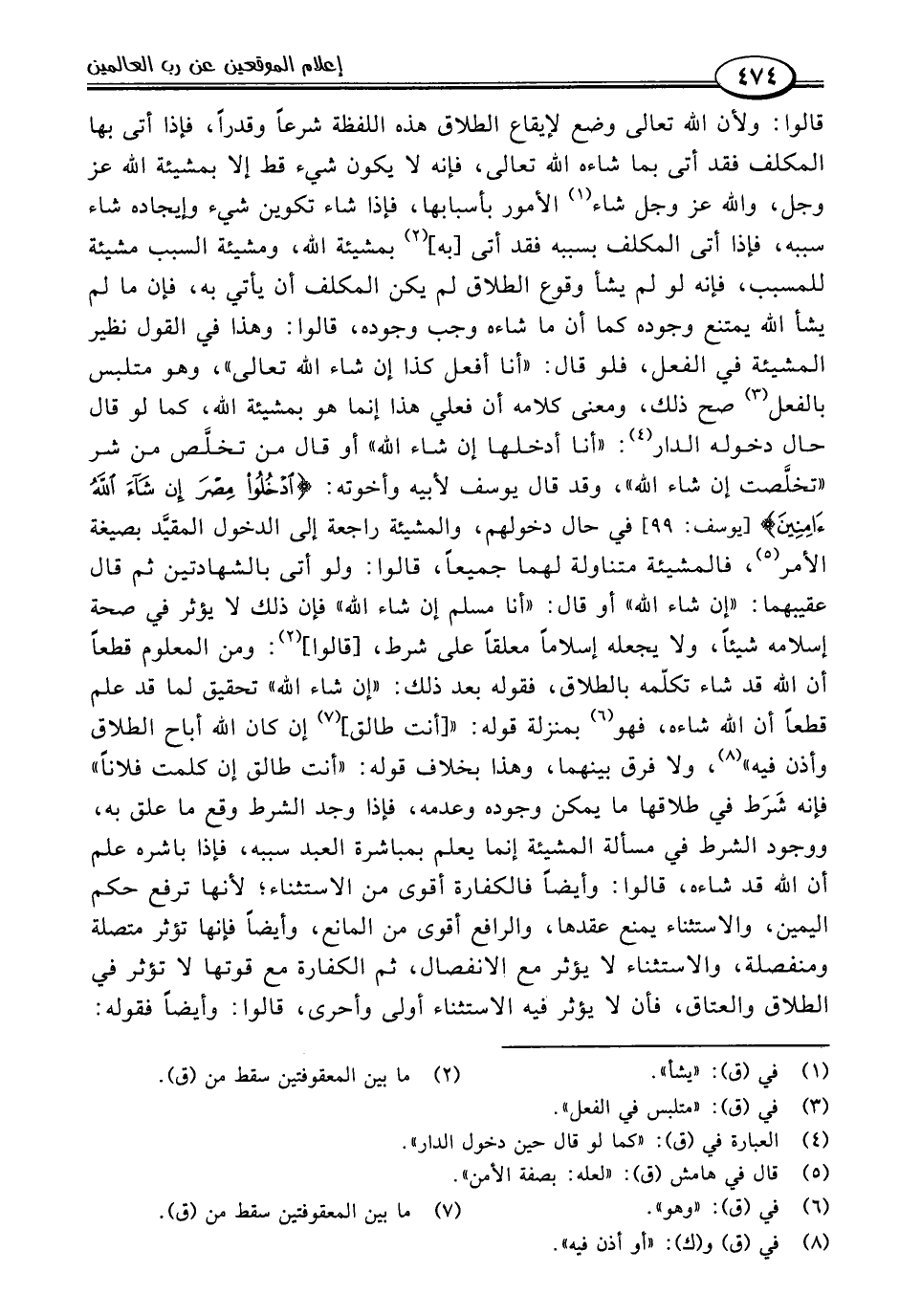 قالوا: ولأن اللَّه تعالى وضع لإيقاع الطلاق هذه اللفظة شرعًا وقدرًا، فإذا أتى بها المكلف فقد أتى بما شاءه اللَّه تعالى، فإنه لا يكون شيء قط إلا بمشيئة اللَّه عز وجل، واللَّه عز وجل شاء (١) الأمور بأسبابها، فإذا شاء تكوين شيء وإيجاده شاء سببه، فإذا أتى المكلف بسببه فقد أتى [به] (٢) بمشيئة اللَّه، ومشيئة السبب مشيئة للمسبب، فإنه لو لم يشأ وقوع الطلاق لم يكن المكلف أن يأتي به، فإن ما لم يشأ اللَّه يمتنع وجوده كما أن ما شاءه وجب وجوده، قالوا: وهذا في القول نظير المشيئة في الفعل، فلو قال: "أنا أفعل كذا إن شاء اللَّه تعالى"، وهو متلبس بالفعل (٣) صح ذلك، ومعنى كلامه أن فعلي هذا إنما هو بمشيئة اللَّه، كما لو قال حال دخوله الدار (٤): "أنا أدخلها إن شاء اللَّه" أو قال من تخلَّص من شر "تخلَّصت إن شاء اللَّه"، وقد قال يوسف لأبيه وأخوته: {ادْخُلُوا مِصْرَ إِنْ شَاءَ اللَّهُ آمِنِينَ} [يوسف: ٩٩] في حال دخولهم، والمشيئة راجعة إلى الدخول المقيَّد بصيغة الأمر (٥)، فالمشيئة متناولة لهما جميعًا، قالوا: ولو أتى بالشهادتين ثم قال عقيبهما: "إن شاء اللَّه" أو قال: "أنا مسلم إن شاء اللَّه" فإن ذلك لا يؤثر في صحة إسلامه شيئًا، ولا يجعله إسلامًا معلقًا على شرط، [قالوا] (٢): ومن المعلوم قطعًا أن اللَّه قد شاء تكلّمه بالطلاق، فقوله بعد ذلك: "إن شاء اللَّه" تحقيق لما قد علم قطعًا أن اللَّه شاءه، فهو (٦) بمنزلة قوله: " [أنت طالق] (٧) إن كان اللَّه أباح الطلاق وأذن فيه" (٨)، ولا فرق بينهما، وهذا بخلاف قوله: "أنت طالق إن كلمت فلانًا" فإنه شَرَط في طلاقها ما يمكن وجوده وعدمه، فإذا وجد الشرط وقع ما علق به، ووجود الشرط في مسألة المشيئة إنما يعلم بمباشرة العبد سببه، فإذا باشره علم أن اللَّه قد شاءه، قالوا: وأيضًا فالكفارة أقوى من الاستثناء؛ لأنها ترفع حكم اليمين، والاستثناء يمنع عقدها، والرافع أقوى من المانع، وأيضًا فإنها تؤثر متصلة ومنفصلة، والاستثناء لا يؤثر مع الانفصال، ثم الكفارة مع قوتها لا تؤثر في الطلاق والعتاق، فأن لا يؤثر فيه الاستثناء أولى وأحرى، قالوا: وأيضًا فقوله: