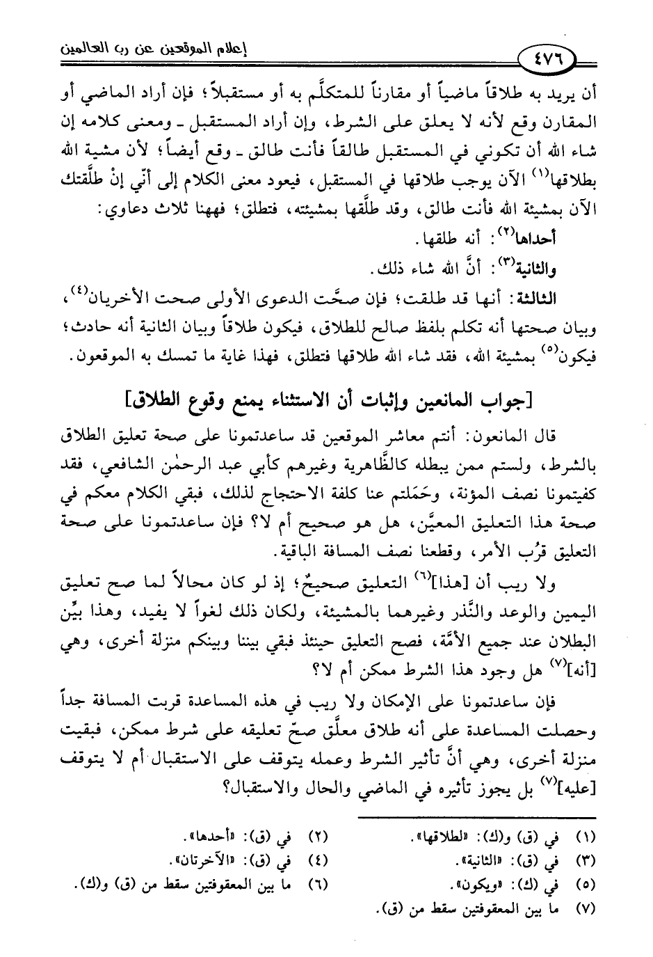 فإن ساعدتمونا على الإمكان ولا ريب في هذه المساعدة قربت المسافة جدًّا وحصلت المساعدة على أنه طلاق معلَّق صحّ تعليقه على شرط ممكن، فبقيت منزلة أخرى، وهي أنَّ تأثير الشرط وعمله يتوقف على الاستقبال أم لا يتوقف [عليه] (٧) بل يجوز تأثيره في الماضي والحال والاستقبال؟