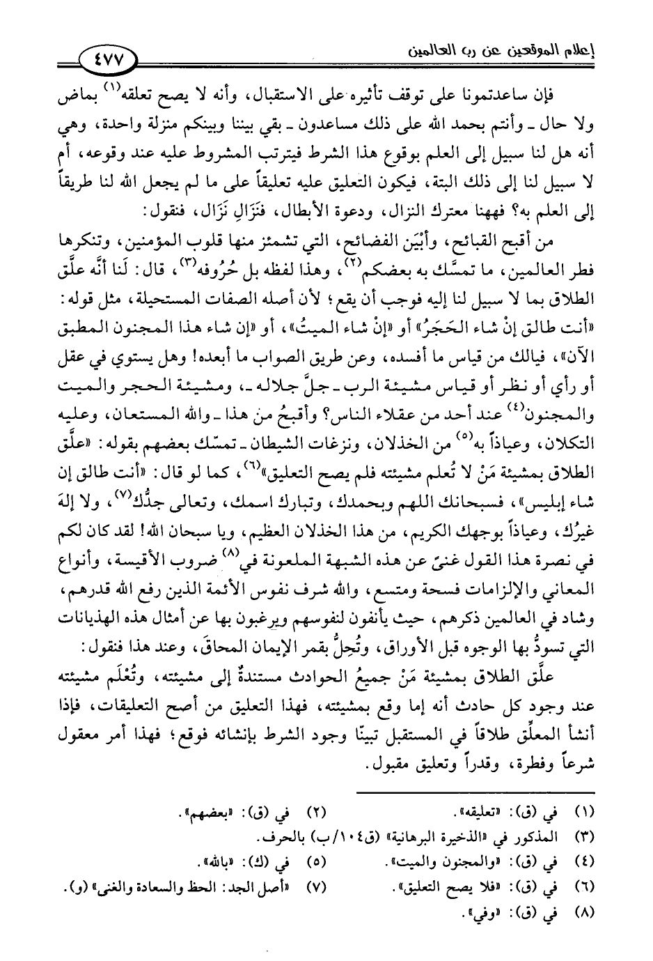 من أقبح القبائح، وأبْيَن الفضائح، التي تشمئز منها قلوب المؤمنين، وتنكرها فطر العالمين، ما تمسَّك به بعضكم (٢)، وهذا لفظه بل حُرُوفه (٣)، قال: لَنا أنَّه علَّق الطلاق بما لا سبيل لنا إليه فوجب أن يقع؛ لأن أصله الصفات المستحيلة، مثل قوله: "أنت طالق إنْ شاء الحَجَرُ" أو "إنْ شاء الميتُ"، أو "إن شاء هذا المجنون المطبق الآن"، فيالك من قياس ما أفسده، وعن طريق الصواب ما أبعده! وهل يستوي في عقل أو رأي أو نظر أو قياس مشيئة الرب -جلَّ جلاله-، ومشيئة الحجر والميت والمجنون (٤) عند أحد من عقلاء الناس؟ وأقبحُ من هذا -واللَّه المستعان، وعليه التكلان، وعياذًا به (٥) من الخذلان، ونزغات الشيطان- تمسّك بعضهم بقوله: "علَّق الطلاق بمشيئة مَنْ لا تُعلم مشيئته فلم يصح التعليق" (٦)، كما لو قال: "أنت طالق إن شاء إبليس"، فسبحانك اللهم وبحمدك، وتبارك اسمك، وتعالى جدُّك (٧)، ولا إلهَ غيرُك، وعياذًا بوجهك الكريم، من هذا الخذلان العظيم، ويا سبحان اللَّه! لقد كان لكم في نصرة هذا القول غنًى عن هذه الشبهة الملعونة في (٨) ضروب الأقيسة، وأنواع المعاني والإلزامات فسحة ومتسع، واللَّه شرف نفوس الأئمة الذين رفع اللَّه قدرهم، وشاد في العالمين ذكرهم، حيث يأنفون لنفوسهم ويرغبون بها عن أمثال هذه الهذيانات التي تسودُّ بها الوجوه قبل الأوراق، وتُحِلُّ بقمر الإيمان المحاقَ، وعند هذا فنقول: