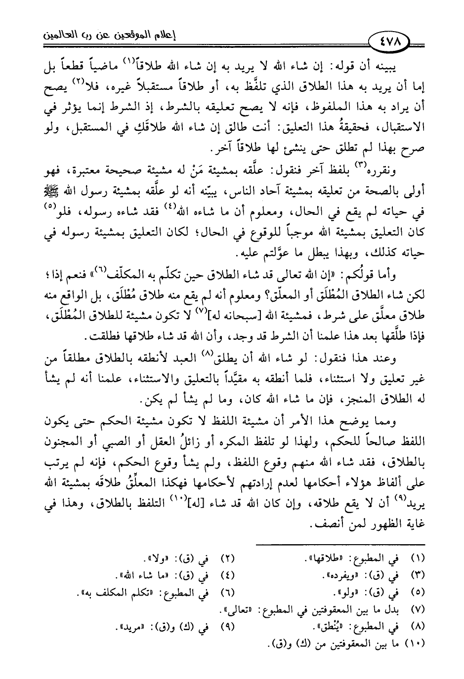 ومما يوضح هذا الأمر أن مشيئة اللفظ لا تكون مشيئة الحكم حتى يكون اللفظ صالحًا للحكم، ولهذا لو تلفظ المكره أو زائلُ العقل أو الصبي أو المجنون بالطلاق، فقد شاء اللَّه منهم وقوع اللفظ، ولم يشأ وقوع الحكم، فإنه لم يرتب على ألفاظ هؤلاء أحكامها لعدم إرادتهم لأحكامها فهكذا المعلِّقُ طلاقَه بمشيئة اللَّه يريد (٩) أن لا يقع طلاقه، وإن كان اللَّه قد شاء [له] (١٠) التلفظ بالطلاق، وهذا في غاية الظهور لمن أنصف.