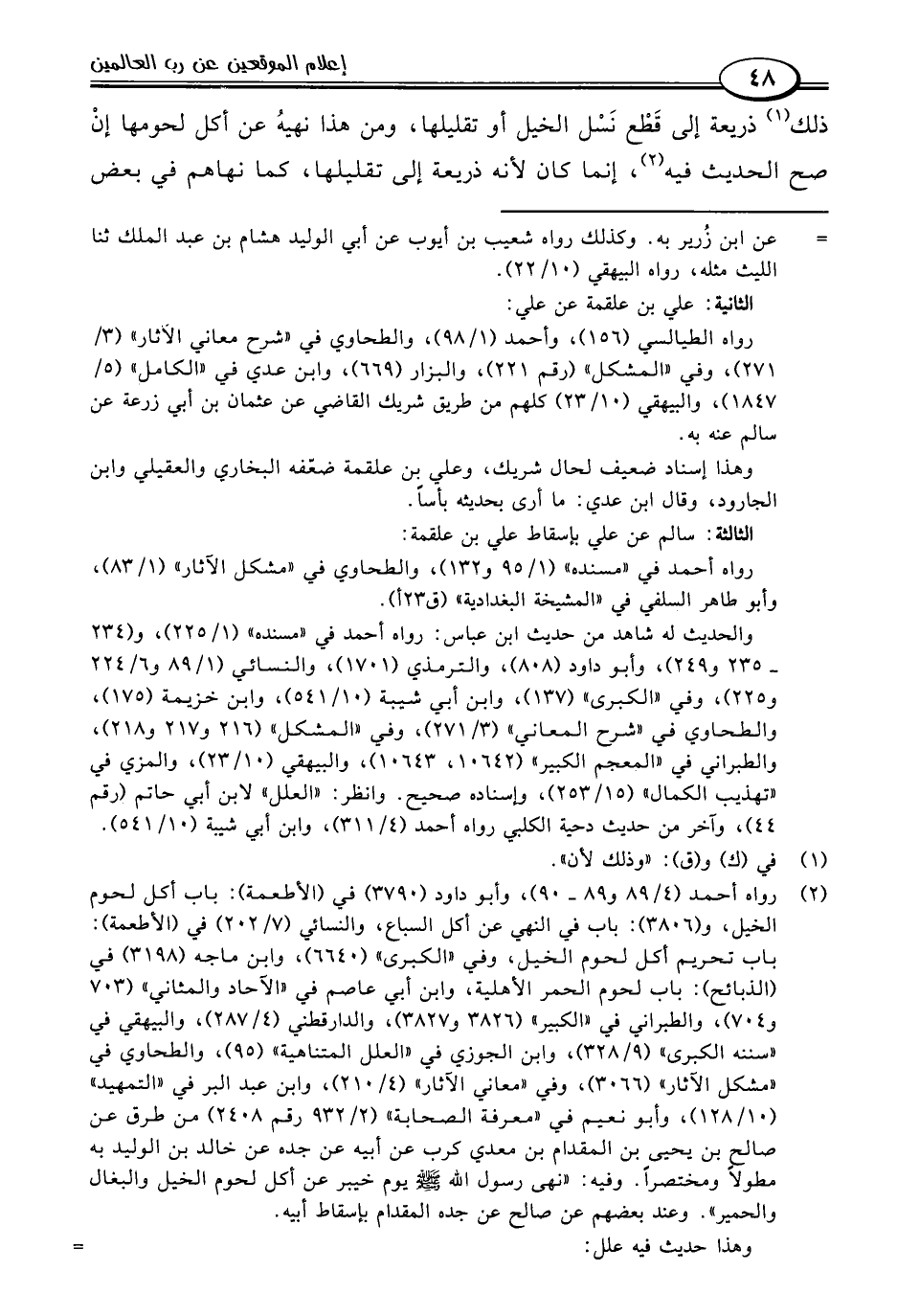 (٢) رواه أحمد (٤/ ٨٩ و ٨٩ - ٩٠)، وأبو داود (٣٧٩٠) في (الأطعمة): باب أكل لحوم الخيل، و (٣٨٠٦): باب في النهي عن أكل السباع، والنسائي (٧/ ٢٠٢) في (الأطعمة): باب تحريم أكل لحوم الخيل، وفي "الكبرى" (٦٦٤٠)، وابن ماجه (٣١٩٨) في (الذبائح): باب لحوم الحمر الأهلية، وابن أبي عاصم في "الآحاد والمثاني" (٧٠٣ و ٧٠٤)، والطبراني في "الكبير" (٣٨٢٦ و ٣٨٢٧)، والدارقطني (٤/ ٢٨٧)، والبيهقي في "سننه الكبرى" (٩/ ٣٢٨)، وابن الجوزي في "العلل المتناهية" (٩٥)، والطحاوي في "مشكل الآثار" (٣٠٦٦)، وفي "معاني الآثار" (٤/ ٢١٠)، وابن عبد البر في "التمهيد" (١٠/ ١٢٨)، وأبو نعيم في "معرفة الصحابة" (٢/ ٩٣٢ رقم ٢٤٠٨) من طرق عن صالح بن يحيى بن المقدام بن معدي كرب عن أبيه عن جده عن خالد بن الوليد به مطولًا ومختصرًا. وفيه: "نهى رسول اللَّه -صلى اللَّه عليه وسلم- يوم خيبر عن أكل لحوم الخيل والبغال والحمير". وعند بعضهم عن صالح عن جده المقدام بإسقاط أبيه.