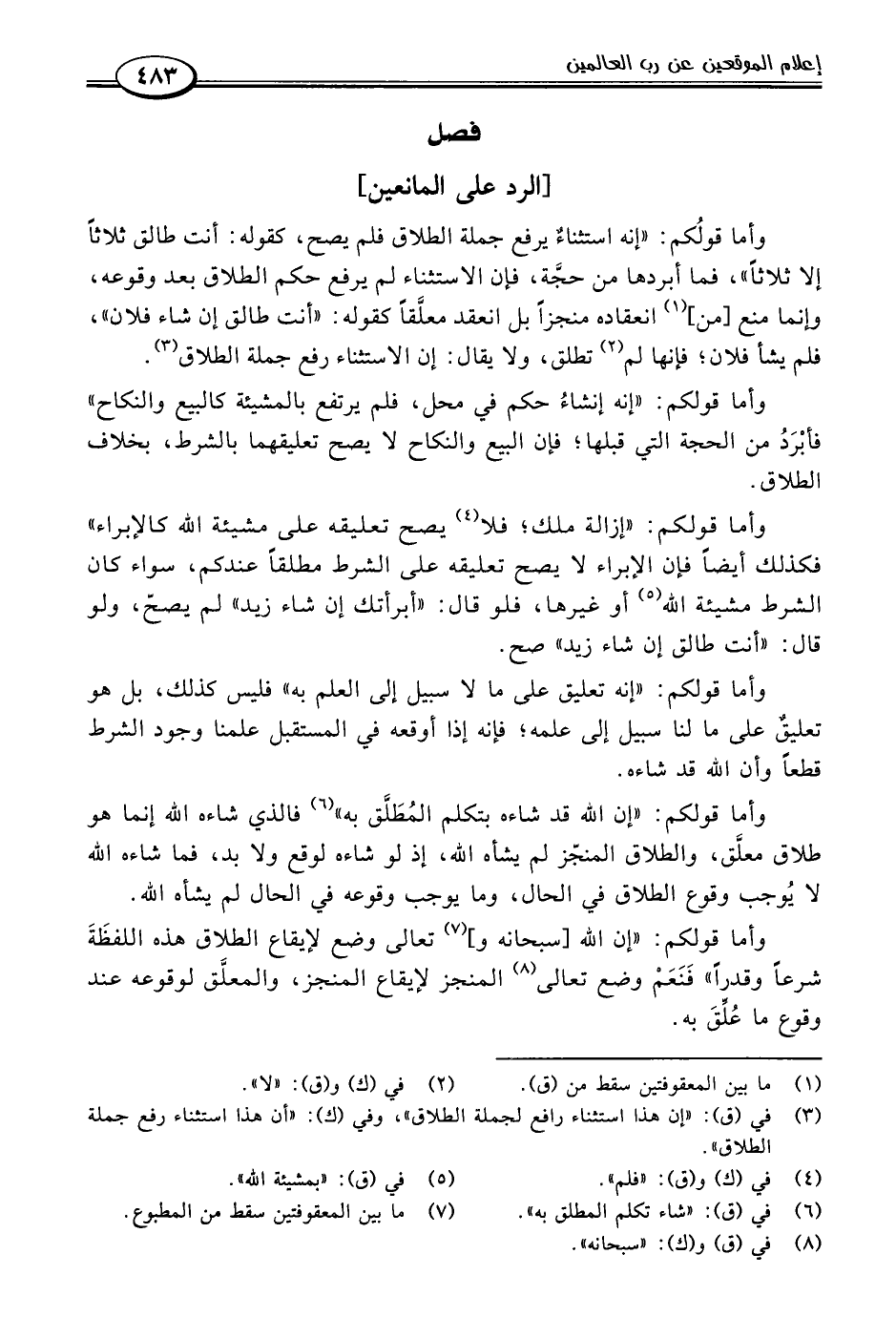 وأما قولكم: "إن اللَّه قد شاءه بتكلم المُطَلَّق به" (٦) فالذي شاءه اللَّه إنما هو طلاق معلَّق، والطلاق المنجّز لم يشأه اللَّه، إذ لو شاءه لوقع ولا بد، فما شاءه اللَّه لا يُوجب وقوع الطلاق في الحال، وما يوجب وقوعه في الحال لم يشأه اللَّه.