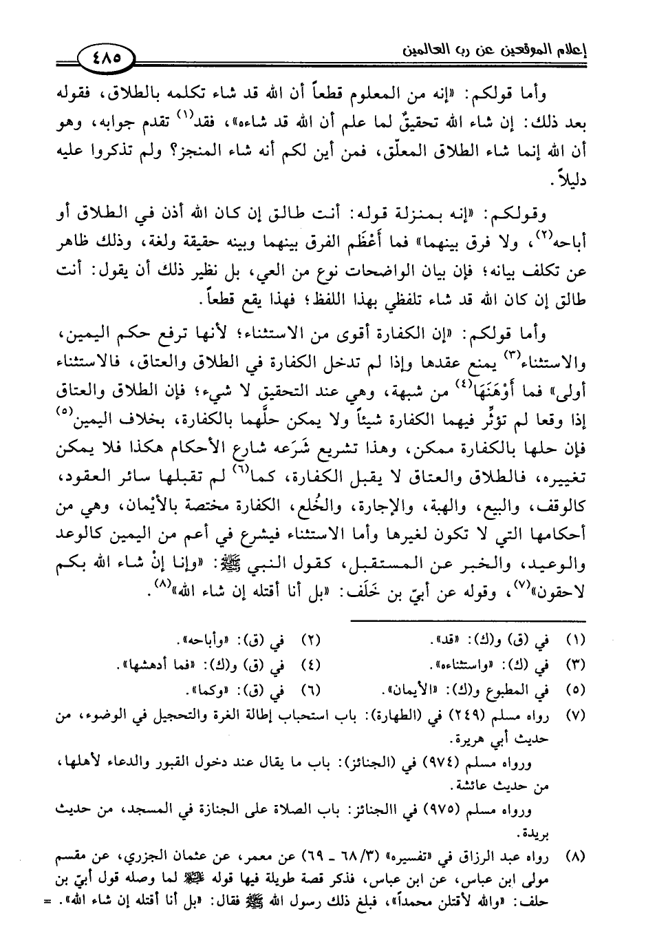 وأما قولكم: "إن الكفارة أقوى من الاستثناء؛ لأنها ترفع حكم اليمين، والاستثناء (٣) يمنع عقدها وإذا لم تدخل الكفارة في الطلاق والعتاق، فالاستثناء أولى" فما أوْهَنَهَا (٤) من شبهة، وهي عند التحقيق لا شيء؛ فإن الطلاق والعتاق إذا وقعا لم تؤثِّر فيهما الكفارة شيئًا ولا يمكن حلَّهما بالكفارة، بخلاف اليمين (٥) فإن حلها بالكفارة ممكن، وهذا تشريع شَرَعه شارع الأحكام هكذا فلا يمكن تغييره، فالطلاق والعتاق لا يقبل الكفارة، كما (٦) لم تقبلها سائر العقود، كالوقف، والبيع، والهبة، والإجارة، والخُلع، الكفارة مختصة بالأيْمان، وهي من أحكامها التي لا تكون لغيرها وأما الاستثناء فيشرع في أعم من اليمين كالوعد والوعيد، والخبر عن المستقبل، كقول النبي -صلى اللَّه عليه وسلم-: "وإنا إنْ شاء اللَّه بكم لا حقون" (٧)، وقوله عن أبيّ بن خَلَف: "بل أنا أقتله إن شاء اللَّه" (٨).