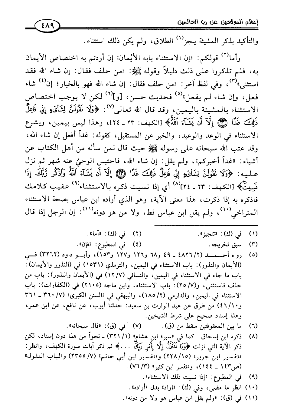 وأما (٢) قولكم: "إن الاستثناء بابه الأيْمان" إن أردتم به اختصاص الأيمان به، فلم تذكروا على ذلك دليلًا وقوله -صلى اللَّه عليه وسلم-: "من حلف فقال: إن شاء اللَّه فقد استثنى" (٣)، وفي لفظ آخر: "من حلف فقال: إن شاء اللَّه فهو بالخيار؛ إن (٤) شاء فعل، وإن شاء لم يفعل" (٥) فحديث حسن، [و] (٦) لكن لا يوجب اختصاص الاستثناء بالمشيئة باليمين، وقد قال اللَّه تعالى (٧): {وَلَا تَقُولَنَّ لِشَيْءٍ إِنِّي فَاعِلٌ ذَلِكَ غَدًا (٢٣) إِلَّا أَنْ يَشَاءَ اللَّهُ} [الكهف: ٢٣ - ٢٤]، وهذا ليس بيمين، ويشرع الاستثناء في الوعد والوعيد، والخبر عن المستقبل، كقوله: غدًا أفعل إن شاء اللَّه، وقد عتب اللَّه سبحانه على رسوله -صلى اللَّه عليه وسلم- حيث قال لمن سأله من أهل الكتاب عن أشياء: "غدًا أخبركم"، ولم يقل: إن شاء اللَّه، فاحتبس الوحيُ عنه شهر ثم نزل عليه: {وَلَا تَقُولَنَّ لِشَيْءٍ إِنِّي فَاعِلٌ ذَلِكَ غَدًا (٢٣) إِلَّا أَنْ يَشَاءَ اللَّهُ وَاذْكُرْ رَبَّكَ إِذَا نَسِيتَ} [الكهف: ٢٣ - ٢٤] (٨) أي إذا نسيت ذكره بالاستثناء (٩) عقيب كلامك فاذكره به إذا ذكرت، هذا معنى الآية، وهو الذي أراده ابن عباس بصحة الاستثناء المتراخي (١٠)، ولم يقل ابن عباس قط، ولا من هو دونه (١١): إن الرجل إذا قال