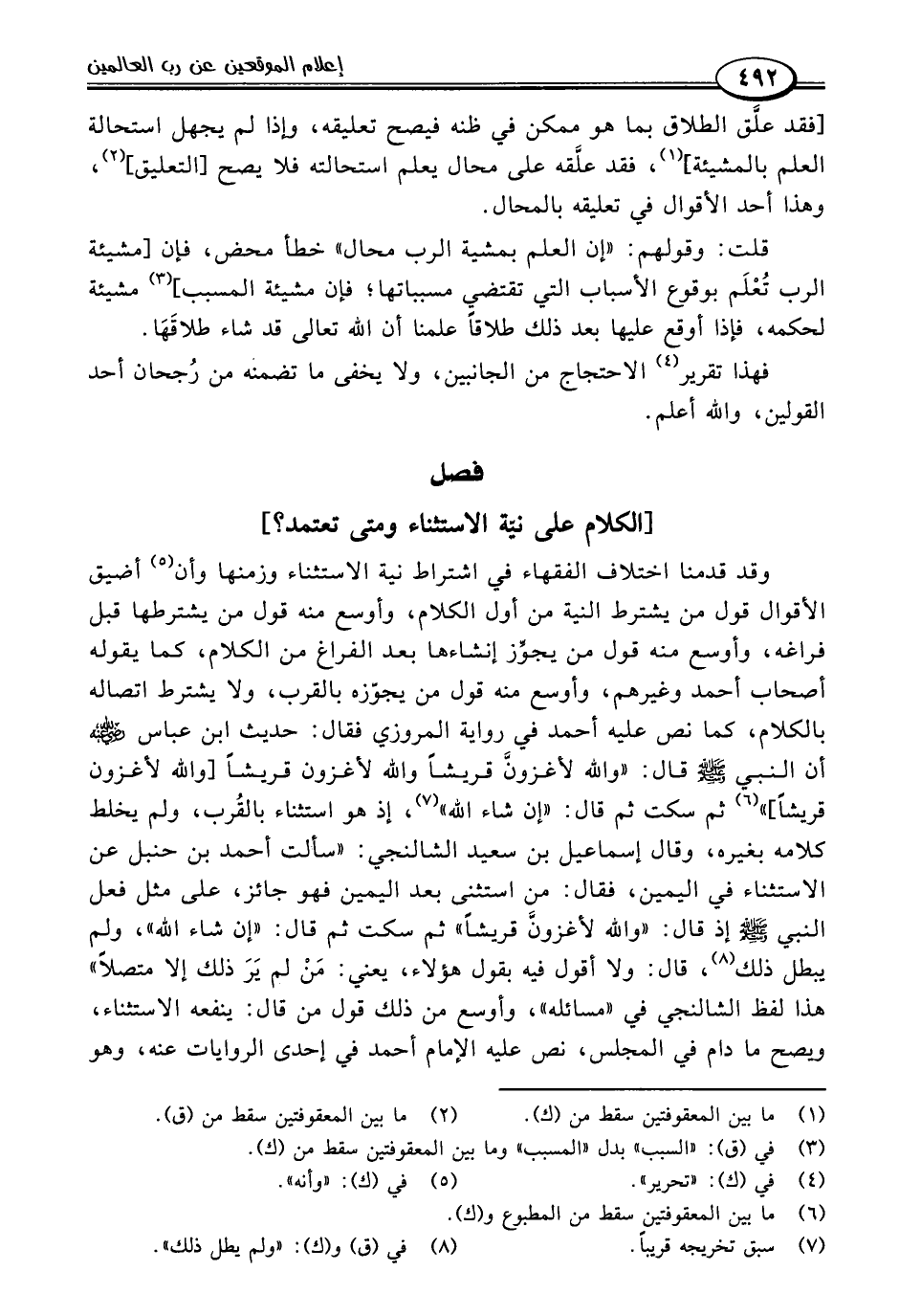 قلت: وقولهم: "إن العلم بمشية الرب محال" خطأ محض، فإن [مشيئة الرب تُعْلَم بوقوع الأسباب التي تقتضي مسبباتها؛ فإن مشيئة المسبب] (٣) مشيئة لحكمه، فإذا أوقع عليها بعد ذلك طلاقًا علمنا أن اللَّه تعالى قد شاء طلاقَهَا.