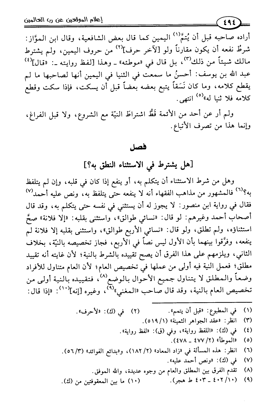 وهل من شرط الاستثناء أن يتكلم به، أو ينفع إذا كان في قلبه، وإن لم يتلفظ به؟ (٦) فالمشهور من مذاهب الفقهاء أنه لا ينفعه حتى يتلفظ به، ونص عليه أحمد (٧) فقال في رواية ابن منصور: لا يجوز له أن يستثني في نفسه حتى يتكلم به، وقد قال أصحاب أحمد وغيرهم: لو قال: "نسائي طوالق"، واستثنى بقلبه: "إلا فلانة" صحَّ استثناؤه، ولم تطلق، ولو قال: "نسائي الأربع طوالق"، واستثنى بقلبه إلا فلانة لم ينفعه، وفرَّقوا بينهما بأن الأول ليس نصًا في الأربع، فجاز تخصيصه بالنيّة، بخلاف الثاني، ويلزمهم على هذا الفرق أن يصح تقييده بالشرط بالنية؛ لأن غايته أنه تقييد مطلق؛ فعمل النية فيه أولى من عملها في تخصيص العام؛ لأن العام متناول للأفراد وضعًا والمطلق لا يتناول جميع الأحوال بالوضع (٨)، فتقييده بالنية أولى من تخصيص العام بالنية، وقد قال صاحب "المغني" (٩)، وغيره [إنه] (١٠): "إذا قال: