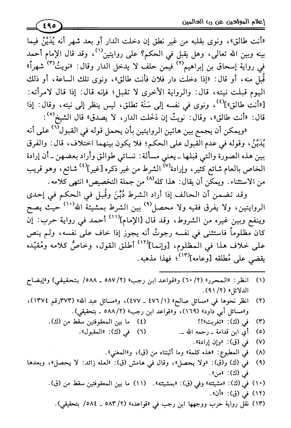 "أنت طالق"، ونوى بقلبه من غير نطق إن دخلت الدار أو بعد شهر أنه يُدَيَّنُ فيما بينه وبين اللَّه تعالى، وهل يقبل في الحكم؟ على روايتين (١)، وقد قال الإمام أحمد في رواية إسحاق بن إبراهيم (٢) فيمن حلف لا يدخل الدار وقال: "نويتُ (٣) شهرًا" قُبل منه، أو قال: "إذا دخلت دار فلان فأنت طالق"، ونوى تلك الساعة، أو ذلك اليوم قبلت نيته، قال: والرواية الأخرى لا تقبل؛ فإنه قال: إذا قال لامرأته: ["أنت طالق"] (٤)، ونوى في نفسه إلى سَنَة تطلق، ليس ينظر إلى نيته، وقال: إذا قال: "أنت طالق"، وقال: نويتُ إن دَخَلت الدار، لا يصدق" قال الشيخ (٥):
