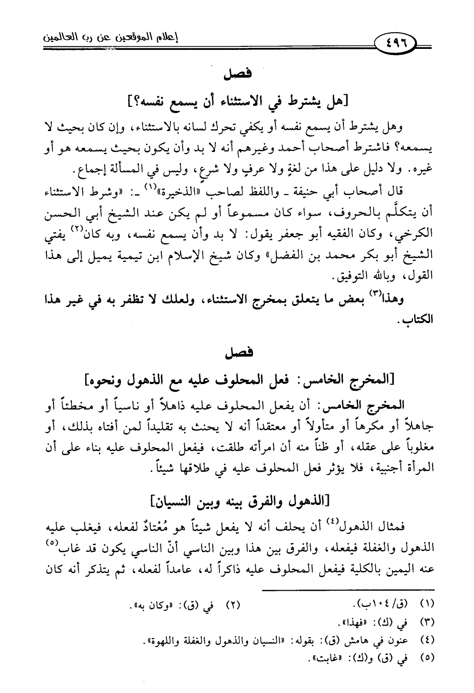 قال أصحاب أبي حنيفة -واللفظ لصاحب "الذخيرة" (١) -: "وشرط الاستثناء أن يتكلَّم بالحروف، سواء كان مسموعًا أو لم يكن عند الشيخ أبي الحسن الكرخي، وكان الفقيه أبو جعفر يقول: لا بد وأن يسمع نفسه، وبه كان (٢) يفتي الشيخ أبو بكر محمد بن الفضل" وكان شيخ الإسلام ابن تيمية يميل إلى هذا القول، وباللَّه التوفيق.