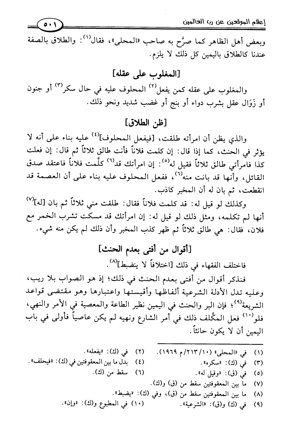 فنذكر أقوال من أفتى بعدم الحنث في ذلك؛ إذ هو الصواب بلا ريب، وعليه تدل الأدلة الشرعية ألفاظها وأقيستها واعتبارها وهو مقتضى قواعد الشريعة (٩)؛ فإن البر والحنث في اليمين نظير الطاعة والمعصية في الأمر والنهي، فلو (١٠) فعل المكَّلف ذلك في أمر الشارع ونهيه لم يكن عاصيًا فأولى في باب اليمين أن لا يكون حانثًا.