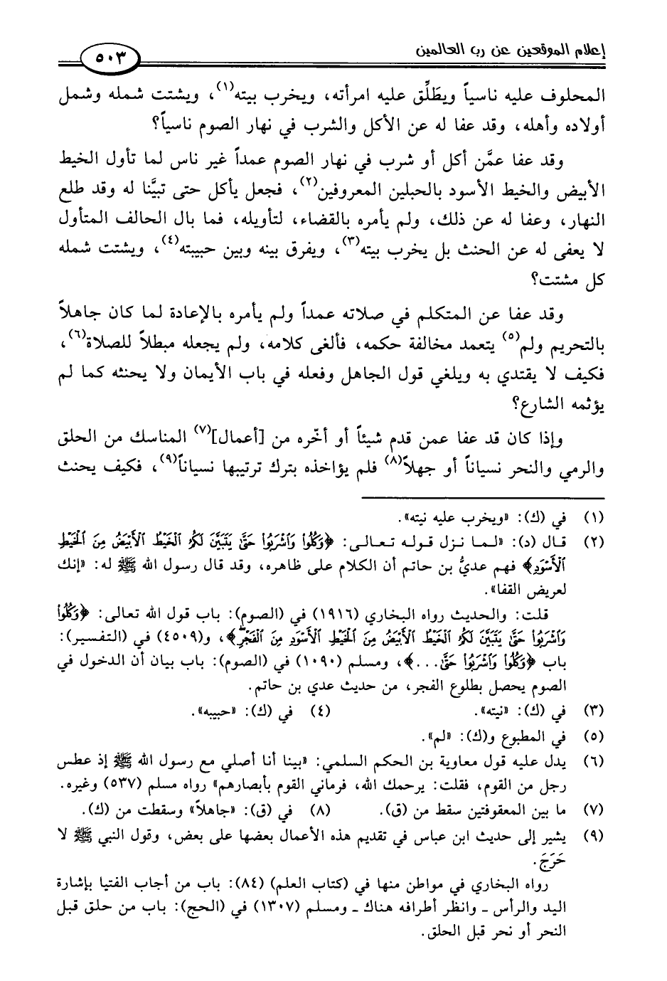 وقد عفا عمَّن أكل أو شرب في نهار الصوم عمدًا غير ناس لما تأول الخيط الأبيض والخيط الأسود بالحبلين المعروفين (٢)، فجعل يأكل حتى تبيَّنا له وقد طلع النهار، وعفا له عن ذلك، ولم يأمره بالقضاء، لتأويله، فما بال الحالف المتأول لا يعفى له عن الحنث بل يخرب بيته (٣)، ويفرق بينه وبين حبيبته (٤)، ويشتت شمله كل مشتت؟