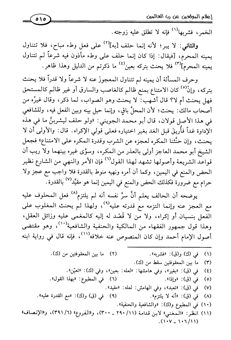 يوضحه أن الحالف يعلم أنَّ سرَّ نفسه أنه لم يلتزم (٨) فعل المحلوف عليه مع العجز عنه وإنما التزمه مع قدرته عليه (٩)، ولهذا لم يحنث المغلوب على الفعل بنسيان أو إكراه، ولا من لا قَصْد له إليه كالمغمى عليه وزائل العقل، وهذا قول جمهور الفقهاء من المالكية والحنفية والشافعية (١٠)، وهو مقتضى أصول الإمام أحمد وإن كان المنصوص عنه خلافه (١١)، فإنه قال في رواية ابنه