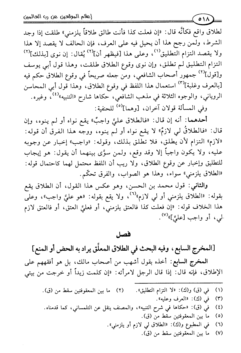 لطلاق واقع فكأنَّه قال: "إن فعلت كذا فأنت طالق طلاقًا يلزمني" طلقت إذا وجد الشرط، ولمن رجح هذا أن يحيل فيه على العرف، فإن الحالف لا يقصد إلا هذا ولا يقصد التزام التطليق (١)، وعلى هذا [فيظهر أن] (٢) يُقال: إن نوى [بذلك] (٢) التزام التطليق لم تطلق، وإن نوى وقوع الطلاق طلقت، وهذا قول أبي يوسف و [قول] (٢) جمهور أصحاب الشافعي، ومن جعله صريحًا في وقوع الطلاق حكم فيه [بالعرف وغلبة] (٣) استعمال هذا اللفظ في وقوع الطلاق، وهذا قول أبي المحاسن الروياني، والوجوه الثلاثة في مذهب الشافعي، حكاها شارح "التنبيه" (٤)، وغيره.
