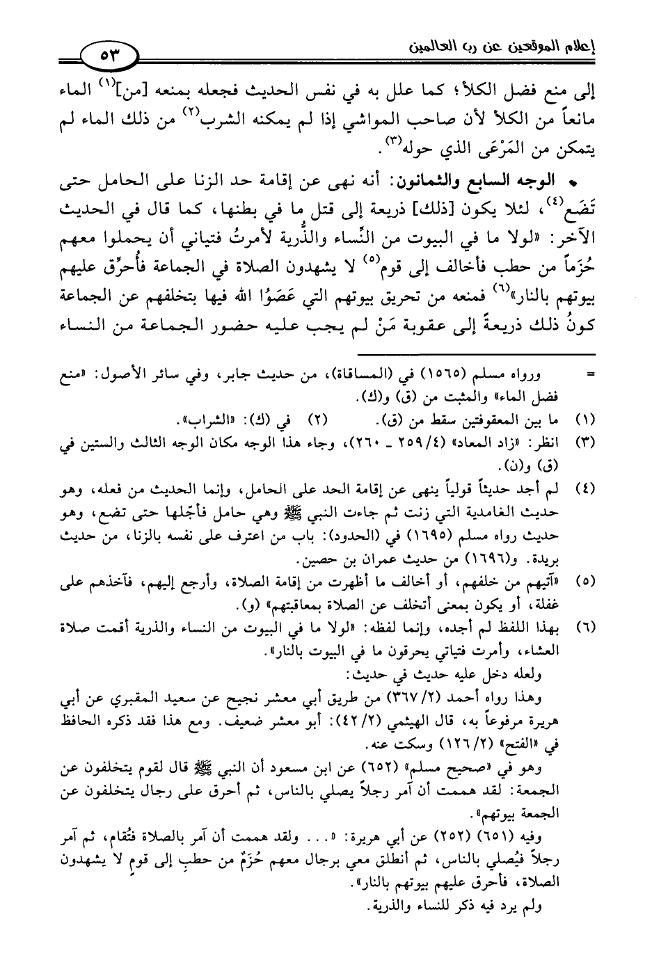 الوجه السابع والثمانون: أنه نهى عن إقامة حد الزنا على الحامل حتى تَضَع (٤)، لئلا يكون [ذلك] ذريعة إلى قتل ما في بطنها، كما قال في الحديث الآخر: "لولا ما في البيوت من النِّساء والذرية لأمرتُ فتياني أن يحملوا معهم حُزَمًا من حطب فاخالف إلى قوم (٥) لا يشهدون الصلاة في الجماعة فأُحرِّق عليهم بيوتهم بالنار" (٦) فمنعه من تحريق بيوتهم التي عَصَوُا اللَّه فيها بتخلفهم عن الجماعة كونُ ذلك ذريعةً إلى عقوبة مَنْ لم يجب عليه حضور الجماعة من النساء