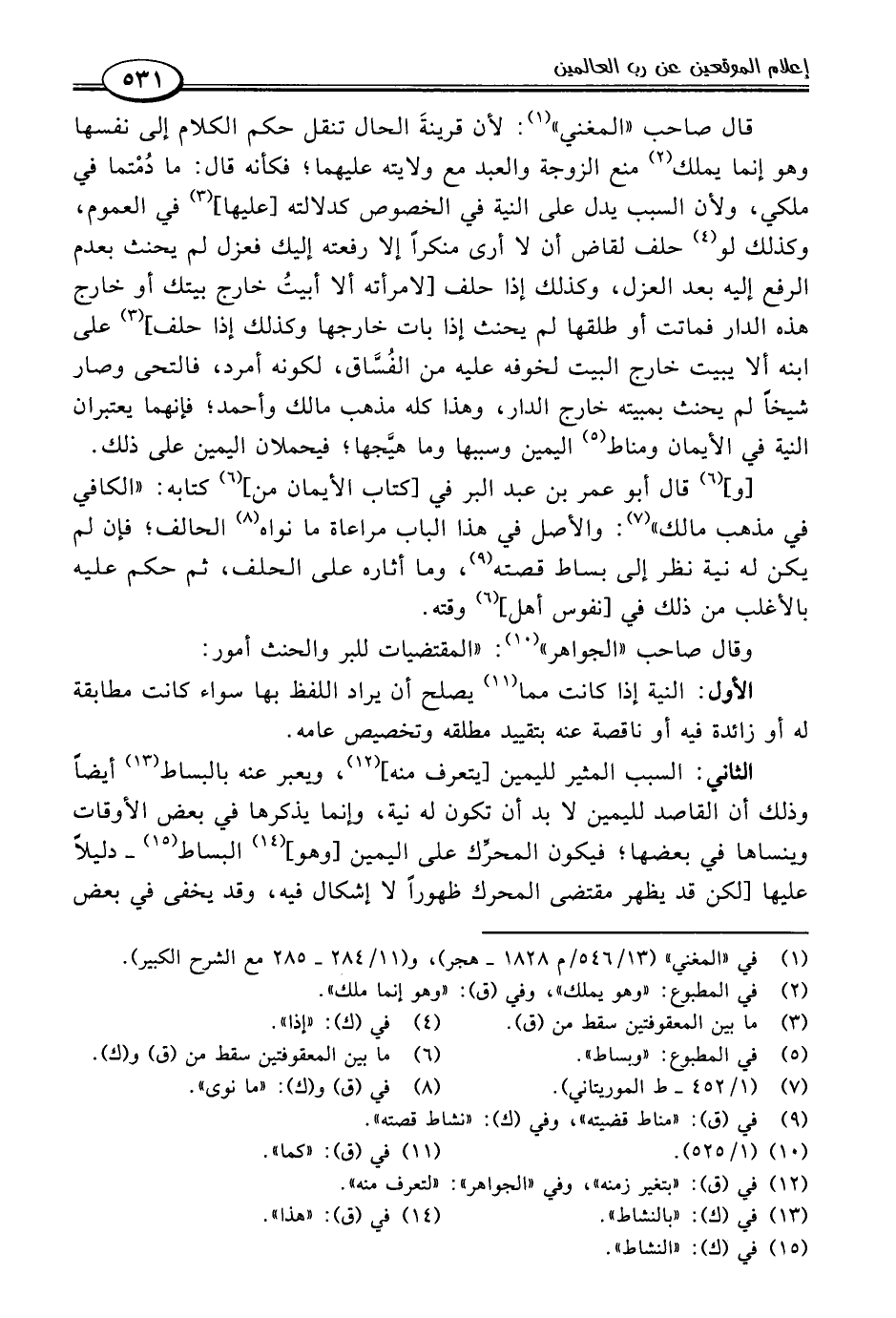قال صاحب "المغني" (١): لأن قرينةَ الحال تنقل حكم الكلام إلى نفسها وهو إنما يملك (٢) منع الزوجة والعبد مع ولايته عليهما؛ فكأنه قال: ما دُمْتما في ملكي، ولأن السبب يدل على النية في الخصوص كدلالته [عليها] (٣) في العموم، وكذلك لو (٤) حلف لقاض أن لا أرى منكرًا إلا رفعته إليك فعزل لم يحنث بعدم الرفع إليه بعد العزل، وكذلك إذا حلف [لامرأته ألا أبيتُ خارج بيتك أو خارج هذه الدار فماتت أو طلقها لم يحنث إذا بات خارجها وكذلك إذا حلف] (٣) على ابنه ألا يبيت خارج البيت لخوفه عليه من الفُسَّاق، لكونه أمرد، فالتحى وصار شيخًا لم يحنث بمبيته خارج الدار، وهذا كله مذهب مالك وأحمد؛ فإنهما يعتبران النية في الأيمان ومناط (٥) اليمين وسببها وما هيَّجها؛ فيحملان اليمين على ذلك.