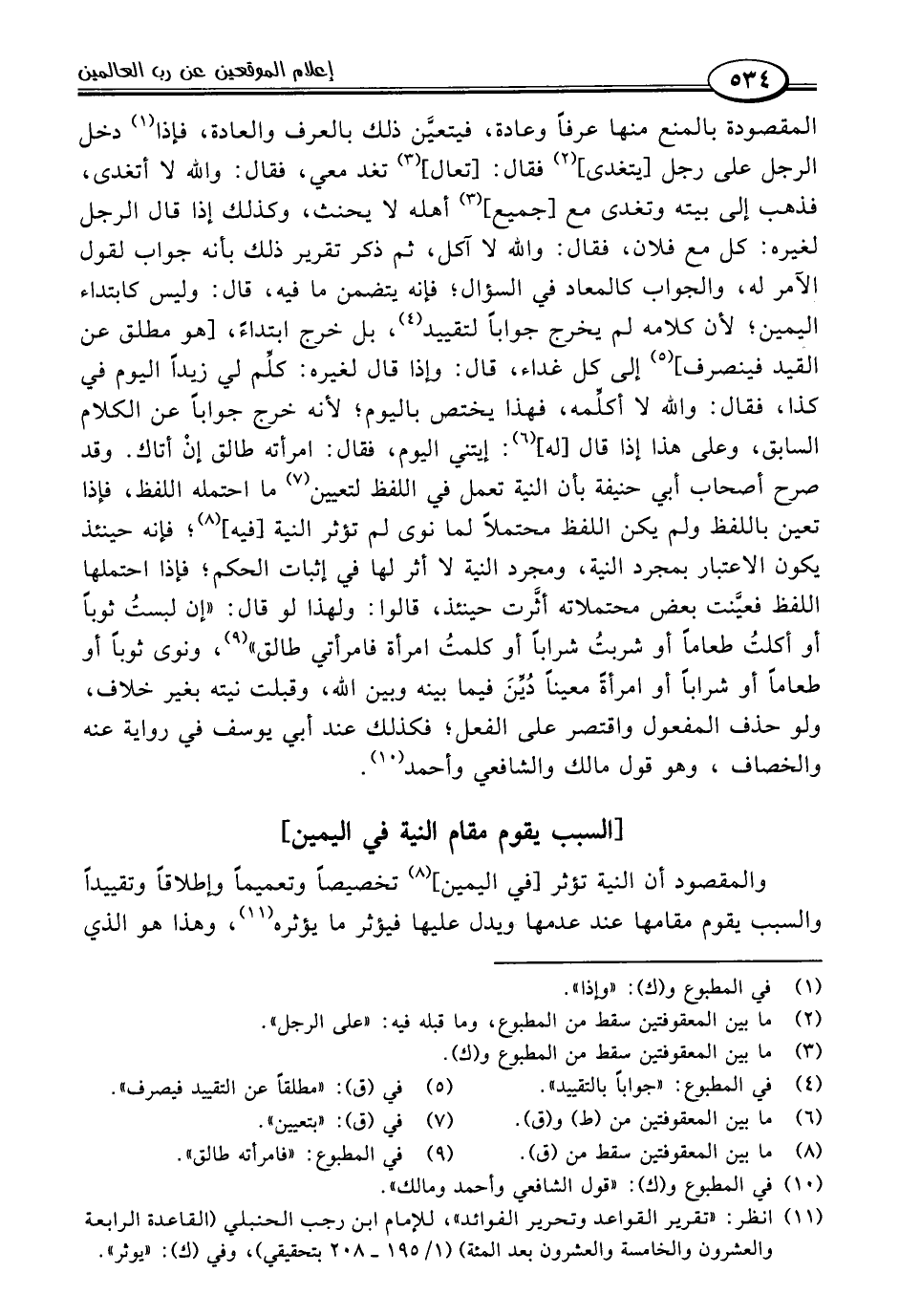 والمقصود أن النية تؤثر [في اليمين] (٨) تخصيصًا وتعميمًا وإطلاقًا وتقييدًا والسبب يقوم مقامها عند عدمها ويدل عليها فيؤثر ما يؤثره (١١)، وهذا هو الذي