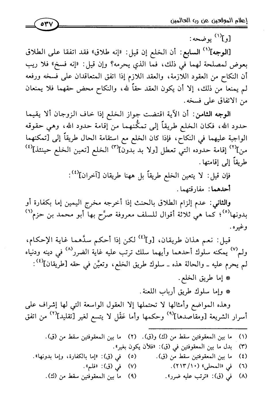 قيل: نعم هذان طريقان، [و] (٤) لكن إذا أحكم سدَّهما غاية الإحكام، ولم (٧) يمكنه سلوك أحدهما وأيهما سلك ترتب عليه غاية الضرر (٨) في دينه ودنياه لم يحرم عليه -والحالة هذه- سلوك طريق الخلع، وتعيَّن في حقه [طريقان] (٤):