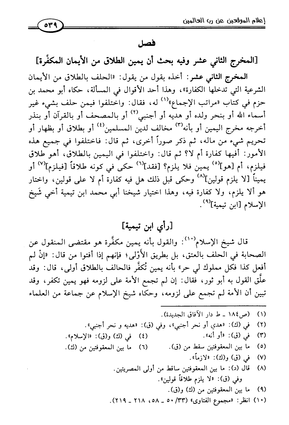 قال شيخ الإسلام (١٠): والقول بأنه يمين مكفَّرة هو مقتضى المنقول عن الصحابة في الحلف بالعتق، بل بطريق الأَوْلى؛ فإنهم إذا أفتوا من قال: "إنْ لم أفعل كذا فكل مملوك لي حر" بأنه يمين تُكفَّر فالحالف بالطلاق أولى، قال: وقد علَّق القول به أبو ثور، فقال: إن لم تجمع الأمة على لزومه فهو يمين تكفر، وقد تبين أن الأمة لم تجمع على لزومه، وحكاه شيخ الإسلام عن جماعة من العلماء
