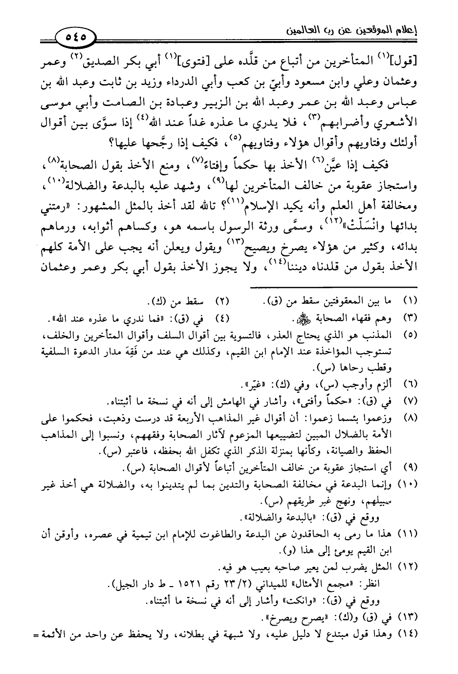[قول] (١) المتأخرين من أتباع من قلَّده على [فتوى] (١) أبي بكر الصديق (٢) وعمر وعثمان وعلي وابن مسعود وأبيّ بن كعب وأبي الدرداء وزيد بن ثابت وعبد اللَّه بن عباس وعبد اللَّه بن عمر وعبد اللَّه بن الزبير وعبادة بن الصامت وأبي موسى الأشعري وأضرابهم (٣)، فلا يدري ما عذره غدًا عند اللَّه (٤) إذا سوَّى بين أقوال أولئك وفتاويهم وأقوال هؤلاء وفتاويهم (٥)، فكيف إذا رجَّحها عليها؟
