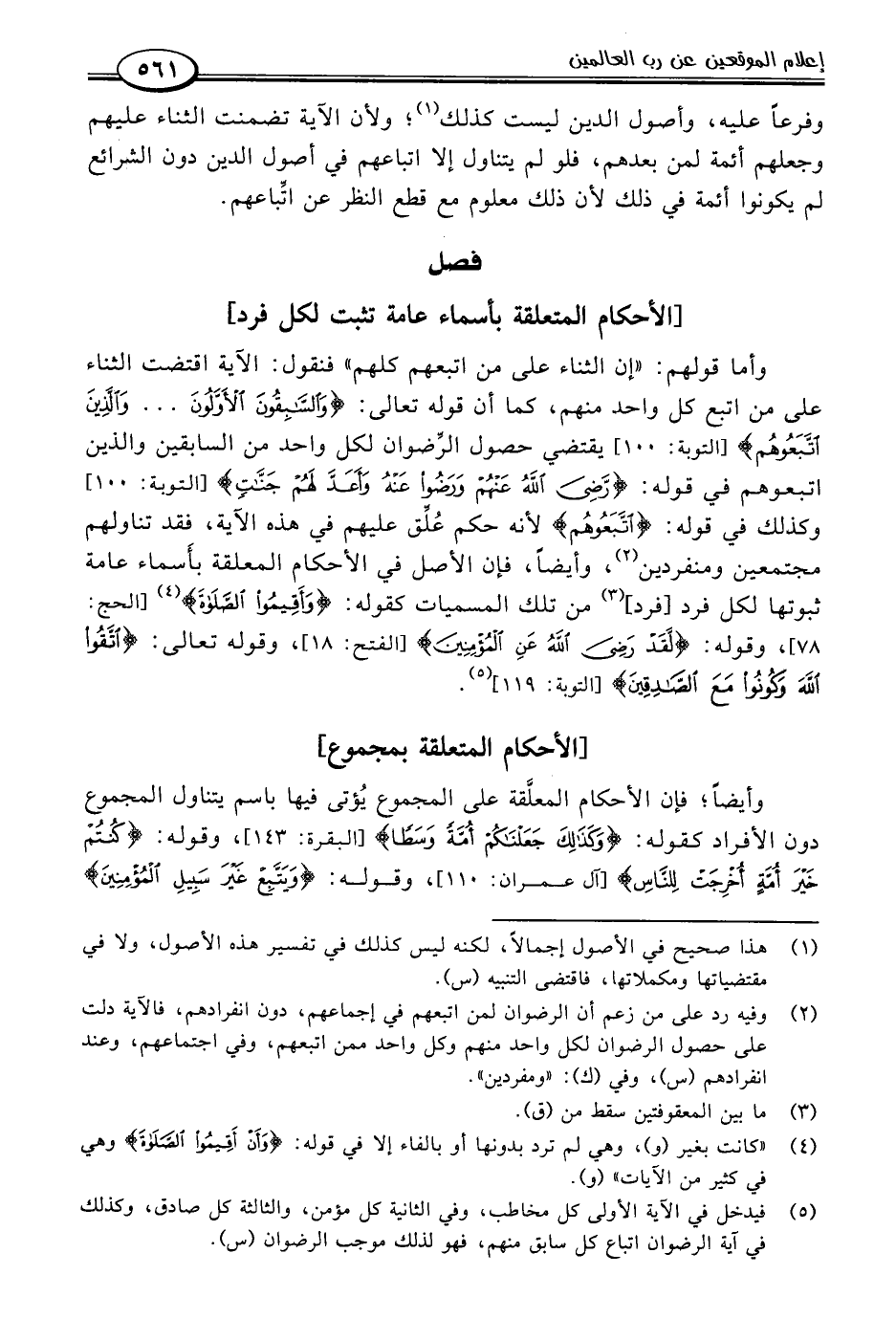 (٥) فيدخل في الآية الأولى كل مخاطب، وفي الثانية كل مؤمن، والثالثة كل صادق، وكذلك في آية الرضوان اتباع كل سابق منهم، فهو لذلك موجب الرضوان (س).