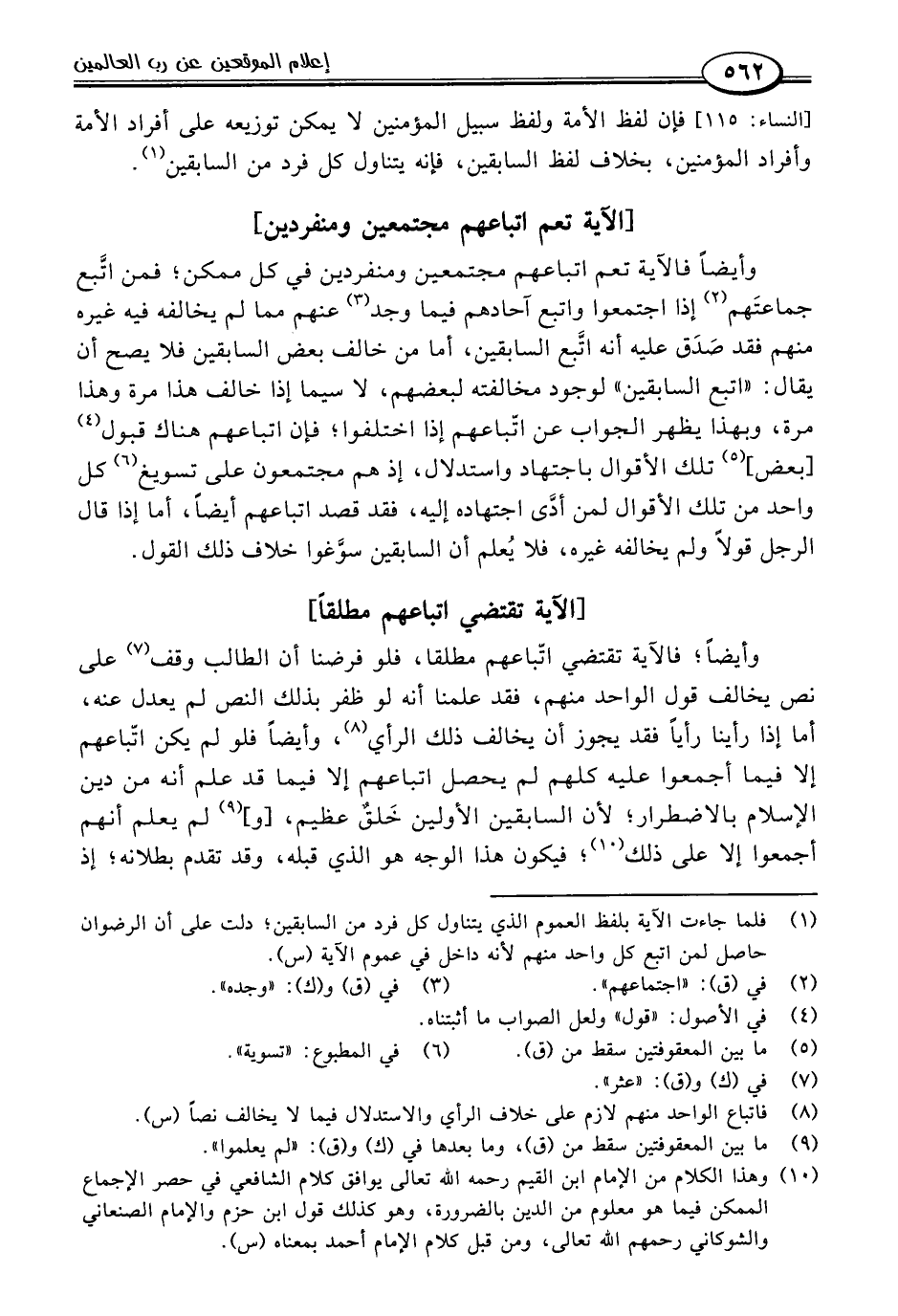 وأيضًا فالآية تعم اتباعهم مجتمعين ومنفردين في كل ممكن؛ فمن اتَّبع جماعتَهم (٢) إذا اجتمعوا واتبع آحادهم فيما وجد (٣) عنهم مما لم يخالفه فيه غيره منهم فقد صَدَق عليه أنه اتَّبع السابقين، أما من خالف بعض السابقين فلا يصح أن يقال: "اتبع السابقين" لوجود مخالفته لبعضهم، لا سيما إذا خالف هذا مرة وهذا مرة، وبهذا يظهر الجواب عن اتّباعهم إذا اختلفوا؛ فإن اتباعهم هناك قبول (٤) [بعض] (٥) تلك الأقوال باجتهاد واستدلال، إذ هم مجتمعون على تسويغ (٦) كل واحد من تلك الأقوال لمن أدَّى اجتهاده إليه، فقد قصد اتباعهم أيضًا، أما إذا قال الرجل قولًا ولم يخالفه غيره، فلا يُعلم أن السابقين سوَّغوا خلاف ذلك القول.