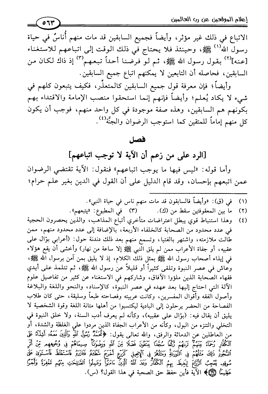 وأيضًا؛ فإن معرفة قول جميع السابقين كالمتعذِّر، فكيف يتبعون كلهم في شيء لا يكاد يُعلم؛ وأيضًا فإنهم إنما استحقوا منصب الإمامة والاقتداء بهم بكونهم هم السابقين، وهذه صفة موجودة في كل واحد منهم، فوجب أن يكون كل منهم إمامًا للمتقين كما استوجب الرضوان والجنَّة (٤).