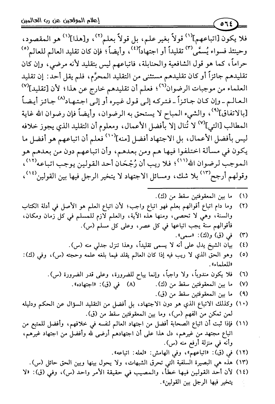 (٥) وهو الحق الذي لا ريب فيه إذا كان العالم يقلد فيما بلغه علمه وحجته (س)، وفي (ك): "للعلماء".