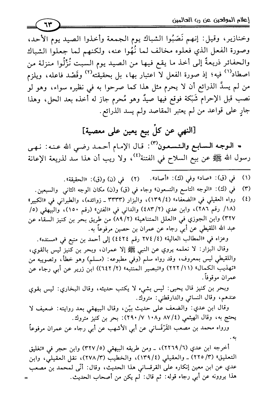الوجه السابع والتسعون (٣): قال الإمام أحمد رضي اللَّه عنه: نهى رسول اللَّه -صلى اللَّه عليه وسلم- عن بيع السلاح في الفتنة (٤)، ولا ريب أن هذا سد لذريعة الإعانة