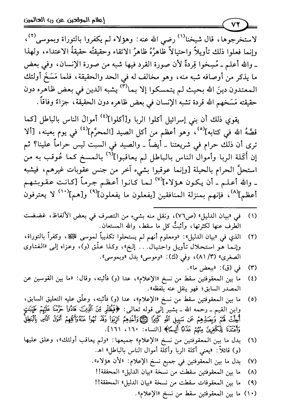 (٥) ما بين المعقوفتين سقط من نسخ "الإعلام"، عدا (و) فأثبته، وعلّق عليه التعليق السابق، وابن القيم -رحمه اللَّه- لشير إلى قوله تعالى: {فَبِظُلْمٍ مِنَ الَّذِينَ هَادُوا حَرَّمْنَا عَلَيْهِمْ طَيِّبَاتٍ أُحِلَّتْ لَهُمْ وَبِصَدِّهِمْ عَنْ سَبِيلِ اللَّهِ كَثِيرًا (١٦٠) وَأَخْذِهِمُ الرِّبَا وَقَدْ نُهُوا عَنْهُ وَأَكْلِهِمْ أَمْوَالَ النَّاسِ بِالْبَاطِلِ وَأَعْتَدْنَا لِلْكَافِرِينَ مِنْهُمْ عَذَابًا أَلِيمًا} [النساء: ١٦٠، ١٦١].