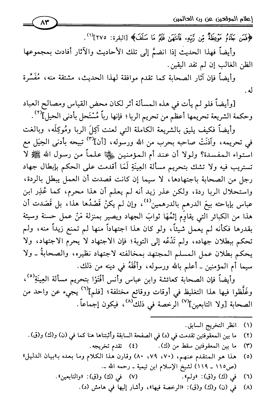 وأيضًا فكيف يليق بالشريعة الكاملة التي لعنت آكِلَ الربا ومُوكِلَه، وبالغت في تحريمه، وآذنَتْ صاحبه بحرب من اللَّه ورسوله، [أن] (٣) تبيحه بأدنى الحِيَل مع استواء المفسدة؟ ولولا أن عند أم المؤمنين -رضي اللَّه عنها- علمًا من رسول اللَّه -صلى اللَّه عليه وسلم- لا تستريب فيه ولا تشك بتحريم مسألة العِينَةِ لَمَا أقدمت على الحكم بإبطال جهاد رجل من الصحابة باجتهادها، لا سيما إن كانت قصدت أن العمل يبطل بالردة، واستحلال الربا ردة، ولكن عذر زيد أنه لم يعلم أن هذا محرم، كما عُذِر ابن عباس بإباحته بيعَ الدرهمِ بالدرهمين (٤)، وإن لم يكنْ قَصْدُها هذا، بل قَصَدت أن هذا من الكبائر التي يقاوِم إثمُها ثوابَ الجهاد ويصير بمنزلة مَنْ عمل حسنة وسيئة بقدرها فكأنه لم يعمل شيئًا، ولو كان هذا اجتهادًا منها لم تمنع زيدًا منه، ولم تحكم ببطلان جهاده، ولم تَدعُه إلى التوبة؛ فإن الاجتهاد لا يحرم الاجتهاد، ولا يحكم بطلان عمل المسلم المجتهد بمخالفته لاجتهاد نظيره، والصحابةُ -ولا سيما أم المؤمنين- أعلم باللَّه ورسوله، وأفْقَهُ في دينه من ذلك.