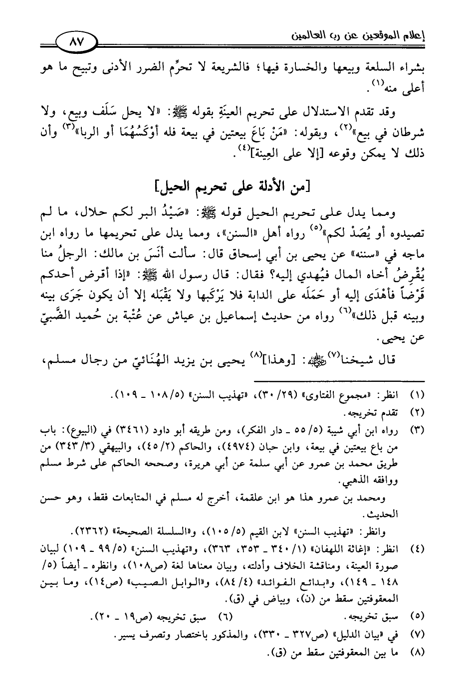 ومما يدل على تحريم الحيل قوله -صلى اللَّه عليه وسلم-: "صَيْدُ البر لكم حلال، ما لم تصيدوه أو يُصَد لكم" (٥) رواه أهل "السنن"، ومما يدل على تحريمها ما رواه ابن ماجه في "سننه" عن يحيى بن أبي إسحاق قال: سألت أنَسَ بن مالك: الرجلُ منا يُقْرِضُ أخاه المال فيُهدي إليه؟ فقال: قال رسول اللَّه -صلى اللَّه عليه وسلم-: "إذا أقرض أحدكم قَرضًا فأهْدَى إليه أو حَمَلَه على الدابة فلا يَركَبها ولا يَقْبَله إلا أن يكون جَرَى بينه وبينه قبل ذلك" (٦) رواه من حديث إسماعيل بن عياش عن عُتْبة بن حُميد الضَبيّ عن يحيى.