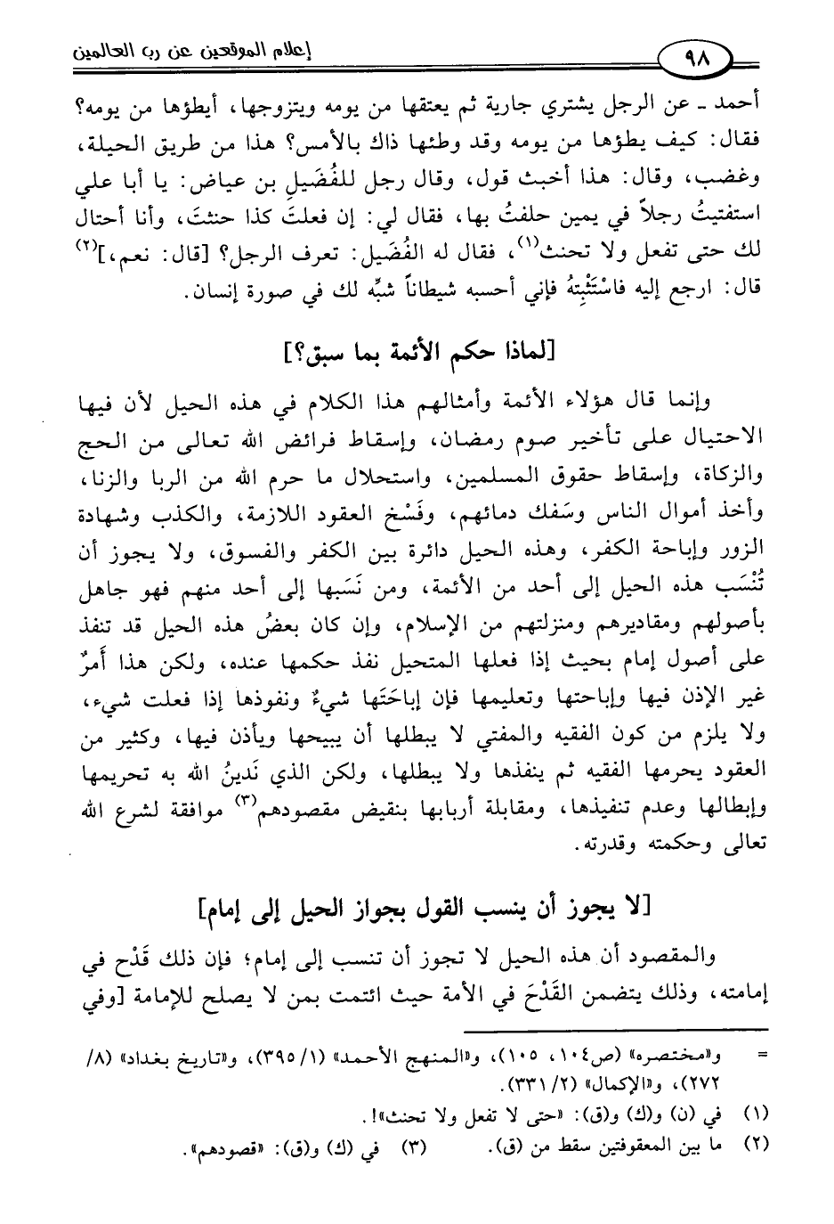 أحمد- عن الرجل يشتري جارية ثم يعتقها من يومه ويتزوجها، أيطؤها من يومه؟ فقال: كيف يطؤها من يومه وقد وطئها ذاك بالأمس؟ هذا من طريق الحيلة، وغضب، وقال: هذا أخبث قول، وقال رجل للفُضَيلِ بن عياض: يا أبا علي استفتيتُ رجلًا في يمين حلفتُ بها، فقال لي: إن فعلتَ كذا حنثتَ، وأنا أحتال لك حتى تفعل ولا تحنث (١)، فقال له الفُضَيل: تعرف الرجل؟ [قال: نعم،] (٢) قال: ارجع إليه فاسْتَثْبِتهُ فإني أحسبه شيطانًا شبِّه لك في صورة إنسان.