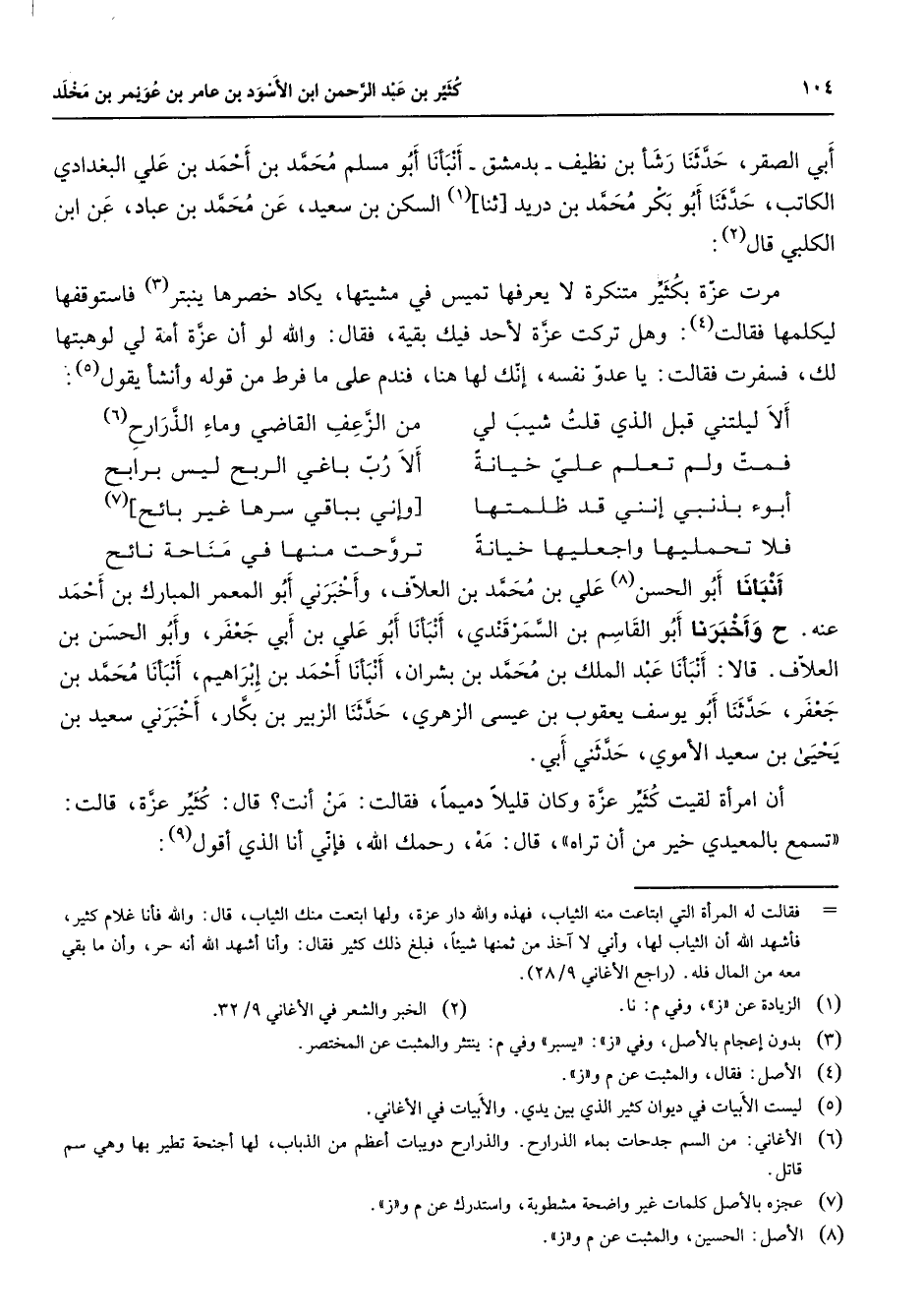 أبي الصقر حدثنا رشأ بن نظيف بدمشق أنبأنا أبو مسلم محمد بن أحمد بن علي البغدادي الكاتب حدثنا أبو بكر محمد بن دريد [ثنا] (1) السكن بن سعيد عن محمد بن عباد عن ابن الكلبي قال (2) مرت عزة بكثير متنكرة لا يعرفها تميس في مشيتها يكاد خصرها ينبتر (3) فاستوقفها ليكلمها فقالت (4) وهل تركت عزة لأحد فيك بقية فقال والله لو أن عزة أمة لي لوهبتها لك فسفرت فقالت يا عدو نفسه إنك لها هنا فندم على ما فرط من قوله وأنشأ يقول (5) : ألا ليتني قبل الذي قلت شيب لي * من الزعف القاضي وماء الذرارح (6) فمت ولم تعلم علي خيانة * ألا رب باغي الربح ليس برابح أبوء بذنبي إنني قد ظلمتها * وإني بباقي سرها غير بائح (7) فلا تحمليها واجعليها خيانة * تروحت منها في مناحة نائح أنبأنا أبو الحسن (8) علي بن محمد بن العلاف وأخبرني أبو المعمر المبارك بن أحمد عنه ح وأخبرنا أبو القاسم بن السمرقندي أنبأنا أبو علي بن أبي جعفر وأبو الحسن بن العلاف قالا أنبأنا عبد الملك بن محمد بن بشران أنبأنا أحمد بن إبراهيم أنبأنا محمد بن جعفر حدثنا أبو يوسف يعقوب بن عيسى الزهري حدثنا الزبير بن بكار أخبرني سعيد بن يحيى بن سعيد الأموي حدثني أبي أن امرأة لقيت كثير عزة وكان قليلا دميما فقالت من أنت قال كثير عزة قالت تسمع بالمعيدي خير من أن تراه قال مه رحمك الله فإني أنا الذي أقول (9) :