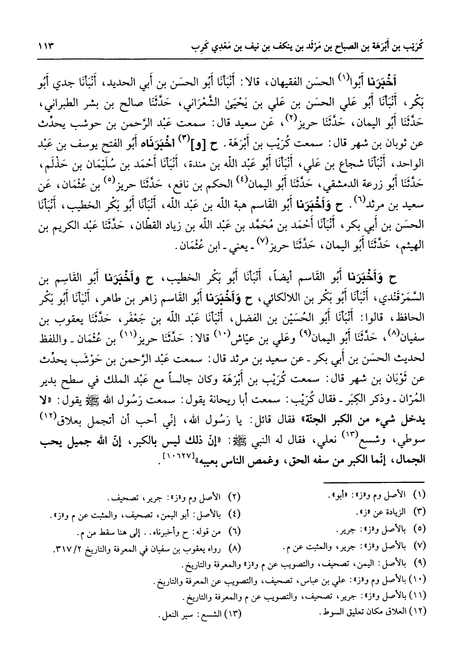 أخبرنا أبوا (1) الحسن الفقيهان قالا أنبأنا أبو الحسن بن أبي الحديد أنبأنا جدي أبو بكر أنبأنا أبو علي الحسن بن علي بن يحيى الشعراني حدثنا صالح بن بشر الطبراني حدثنا أبو اليمان حدثنا حريز (2) عن سعيد قال سمعت عبد الرحمن بن حوشب يحدث عن ثوبان بن شهر قال سمعت كريب بن أبرهة [و] (3) أخبرناه أبو الفتح يوسف بن عبد الواحد أنبأنا شجاع بن علي أنبأنا أبو عبد الله بن مندة أنبأنا أحمد بن سليمان بن حذلم حدثنا أبو زرعة الدمشقي حدثنا أبو اليمان (4) الحكم بن نافع حدثنا حريز (5) بن عثمان عن سعيد بن مرثد (6) ح وأخبرنا أبو القاسم هبة الله بن عبد الله أنبأنا أبو بكر الخطيب أنبأنا الحسن بن أبي بكر أنبأنا أحمد بن محمد بن عبد الله بن زياد القطان حدثنا عبد الكريم بن الهيثم حدثنا أبو اليمان حدثنا حريز (7) يعني ابن عثمان ح وأخبرنا أبو القاسم أيضا أنبأنا أبو بكر الخطيب ح وأخبرنا أبو القاسم بن السمرقندي أنبأنا أبو بكر بن اللالكائي ح وأخبرنا أبو القاسم زاهر بن طاهر أنبأنا أبو بكر الحافظ قالوا أنبأنا أبو الحسين بن الفضل أنبأنا عبد الله بن جعفر حدثنا يعقوب بن سفيان (8) حدثنا أبو اليمان (9) وعلي بن عياش (10) قالا حدثنا حريز (11) بن عثمان واللفظ لحديث الحسن بن أبي بكر عن سعيد بن مرثد قال سمعت عبد الرحمن بن حوشب يحدث عن ثوبان بن شهر قال سمعت كريب بن أبرهة وكان جالسا مع عبد الملك في سطح بدير المران وذكر الكبر فقال كريب سمعت أبا ريحانة يقول سمعت رسول الله (صلى الله عليه وسلم) يقول لا يدخل شئ من الكبر الجنة ح فقال قائل يا رسول الله إني أحب أن أتجمل بعلاق (12) سوطي وشسع (13) نعلي فقال له النبي (صلى الله عليه وسلم) إن ذلك ليس بالكبر إن الله جميل يحب الجمال إنما الكبر من سفه الحق وغمص الناس بعيبه