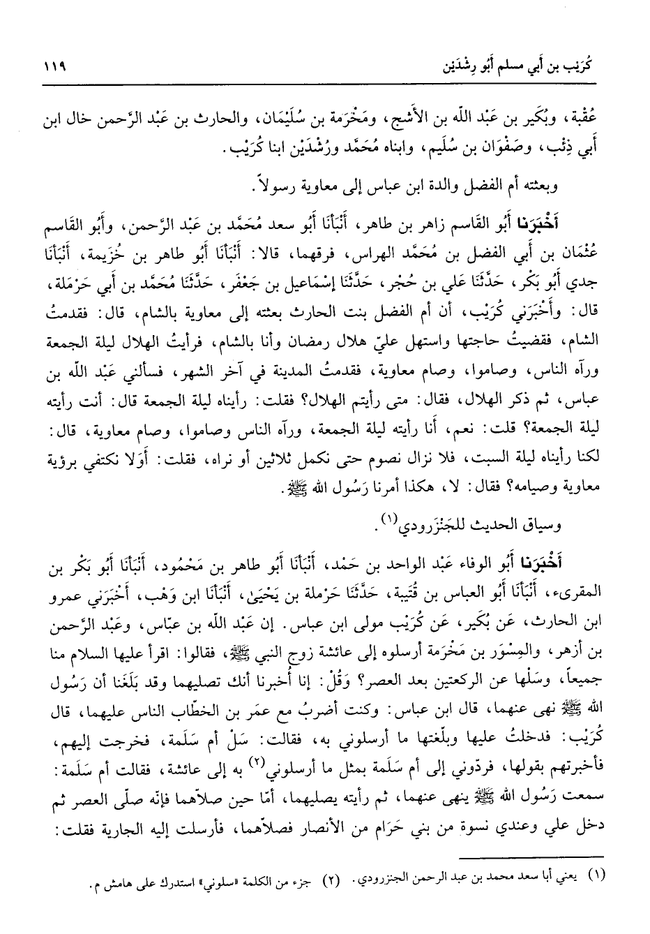 عقبة وبكير بن عبد الله بن الأشج ومخرمة بن سليمان والحارث بن عبد الرحمن خال ابن أبي ذئب وصفوان بن سليم وابناه محمد ورشدين ابنا كريب وبعثته أم الفضل والدة ابن عباس إلى معاوية رسولا أخبرنا أبو القاسم زاهر بن طاهر أنبأنا أبو سعد محمد بن عبد الرحمن وأبو القاسم عثمان بن أبي الفضل بن محمد الهراس فرقهما قالا أنبأنا أبو طاهر بن خزيمة أنبأنا جدي أبو بكر حدثنا علي بن حجر حدثنا إسماعيل بن جعفر حدثنا محمد بن أبي حرملة قال وأخبرني كريب أن أم الفضل بنت الحارث بعثته إلى معاوية بالشام قال فقدمت الشام فقضيت حاجتها واستهل علي هلال رمضان وأنا بالشام فرأيت الهلال ليلة الجمعة ورآه الناس وصاموا وصام معاوية فقدمت المدينة في آخر الشهر فسألني عبد الله بن عباس ثم ذكر الهلال فقال متى رأيتم الهلال فقلت رأيناه ليلة الجمعة قال أنت رأيته ليلة الجمعة قلت نعم أنا رأيته ليلة الجمعة ورآه الناس وصاموا وصام معاوية قال: لكنا رأيناه ليلة السبت فلا نزال نصوم حتى نكمل ثلاثين أو نراه فقلت أولا نكتفي برؤية معاوية وصيامه فقال لا هكذا أمرنا رسول الله (صلى الله عليه وسلم) وسياق الحديث للجنزرودي (1) أخبرنا أبو الوفاء عبد الواحد بن حمد أنبأنا أبو طاهر بن محمود أنبأنا أبو بكر بن المقرئ أنبأنا أبو العباس بن قتيبة حدثنا حرملة بن يحيى أنبأنا ابن وهب أخبرني عمرو ابن الحارث عن بكير عن كريب مولى ابن عباس إن عبد الله بن عباس وعبد الرحمن بن أزهر والمسور بن مخرمة أرسلوه إلى عائشة زوج النبي (صلى الله عليه وسلم) فقالوا اقرأ عليها السلام منا جميعا وسلها عن الركعتين بعد العصر وقل إنا أخبرنا أنك تصليهما وقد بلغنا أن رسول الله (صلى الله عليه وسلم) نهى عنهما قال ابن عباس وكنت أضرب مع عمر بن الخطاب الناس عليهما قال كريب فدخلت عليها وبلغتها ما أرسلوني به فقالت سل أم سلمة فخرجت إليهم فأخبرتهم بقولها فردوني إلى أم سلمة بمثل ما أرسلوني (2) به إلى عائشة فقالت أم سلمة: سمعت رسول الله (صلى الله عليه وسلم) ينهى عنهما ثم رأيته يصليهما أما حين صلاهما فإنه صلى العصر ثم دخل علي وعندي نسوة من بني حرام من الأنصار فصلاهما فأرسلت إليه الجارية فقلت