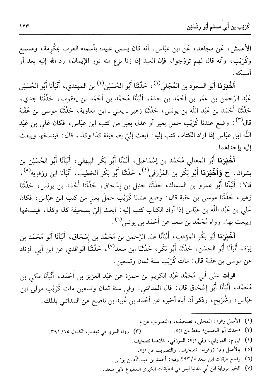 الأعمش عن مجاهد عن ابن عباس أنه كان يسمي عبيده بأسماء العرب عكرمة ومسمع وكريب وأنه قال لهم تزوجوا فإن العبد إذا زنا نزع منه نور الإيمان رد الله إليه بعد أو أمسكه أخبرنا أبو السعود بن المجلي (1) حدثنا أبو الحسين (2) بن المهتدي أنبأنا أبو الحسين عبد الرحمن بن عمر بن أحمد بن حمة أنبأنا محمد بن أحمد بن يعقوب حدثنا جدي حدثنا أحمد بن عبد الله بن يونس حدثنا زهير يعني ابن معاوية حدثنا موسى بن عقبة قال (3) وضع عندنا كريب حمل بعير أو عدل بعير من كتب ابن عباس فكان علي بن عبد الله ابن عباس إذا أراد الكتاب كتب إليه ابعث إلي بصحيفة كذا وكذا قال فينسخها ويبعث إليه بإحداهما أخبرنا أبو المعالي محمد بن إسماعيل أنبأنا أبو بكر البيهقي أنبأنا أبو الحسين بن بشران ح وأخبرنا أبو بكر بن المزرفي (4) حدثنا أبو بكر الخطيب أنبأنا ابن رزقويه (5) قالا أنبأنا أبو عمرو بن السماك حدثنا حنبل بن إسحاق حدثنا أحمد بن يونس حدثنا زهير حدثنا موسى بن عقبة قال وضع عندنا كريب حمل بعير من كتب ابن عباس فكان علي بن عبد الله بن عباس إذا أراد الكتاب كتب إليه ابعث إلي بصحيفة كذا وكذا فينسخها ويبعث بها رواه محمد بن سعد عن أحمد بن يونس (6) أخبرنا أبو بكر المؤدب أنبأنا عبد الرحمن بن محمد بن إسحاق أنبأنا أبو محمد بن يوة أنبأنا أبو الحسن حدثنا أبو بكر حدثنا ابن سعد (7) حدثنا الواقدي عن ابن أبي الزناد عن موسى بن عقبة قال مات كريب سنة ثمان وتسعين قرأت على أبي محمد عبد الكريم بن حمزة عن عبد العزيز بن أحمد أنبأنا مكي بن محمد أنبأنا أبو إسحاق قال قال المدائني وفي سنة ثمان وتسعين مات كريب مولى ابن عباس وشريح وذكر أن أباه أخبره عن أحمد بن عبيد بن ناصح عن المدائني بذلك
