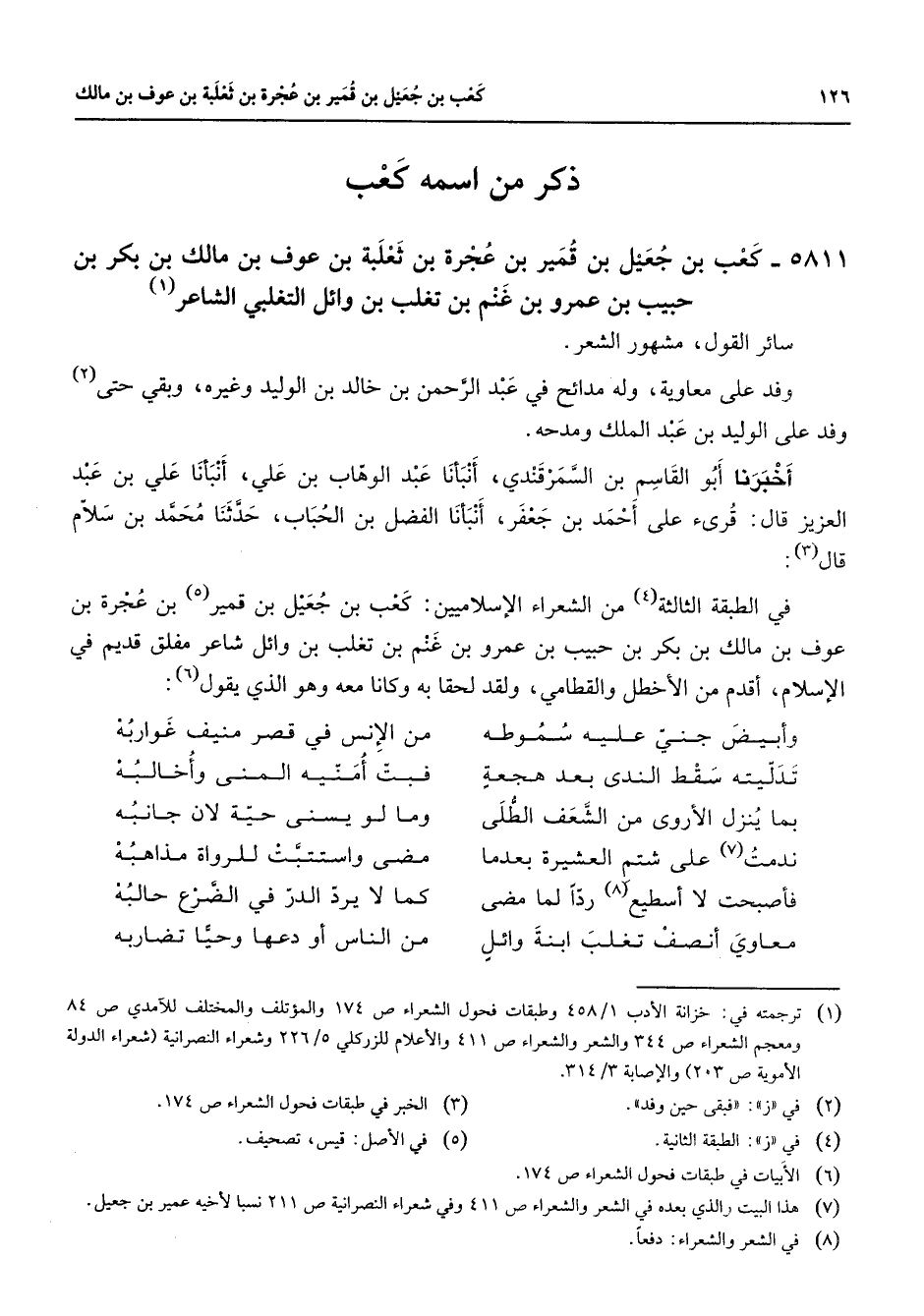 ذكر من اسمه كعب " 5811 - كعب بن جعيل بن قمير بن عجرة بن ثعلبة بن عوف بن مالك بن بكر بن حبيب بن عمرو بن غنم بن تغلب بن وائل التغلبي الشاعر (1) سائر القول مشهور الشعر وفد على معاوية وله مدائح في عبد الرحمن بن خالد بن الوليد وغيره وبقي حتى (2) وفد على الوليد بن عبد الملك ومدحه أخبرنا أبو القاسم بن السمرقندي أنبأنا عبد الوهاب بن علي أنبأنا علي بن عبد العزيز قال قرئ على أحمد بن جعفر أنبأنا الفضل بن الحباب حدثنا محمد بن سلام قال (3) : في الطبقة الثالثة (4) من الشعراء الإسلاميين كعب بن جعيل بن قمير (5) بن عجرة بن عوف بن مالك بن بكر بن حبيب بن عمرو بن غنم بن تغلب بن وائل شاعر مفلق قديم في الإسلام أقدم من الأخطل والقطامي ولقد لحقا به وكانا معه وهو الذي يقول (6) : وأبيض جني عليه سموطه * من الإنس في قصر منيف غواربه تدليته سقط الندى بعد هجعة * فبت أمنيه المنى وأخالبه بما ينزل الأروى من الشعف الطلى * وما لو يسنى حية لان جانبه ندمت (7) على شتم العشيرة بعدما * مضى واستتب للرواة مذاهبه فأصبحت لا أستطع (8) ردا لما مضى * كما لا يرد الدر في الضرع حالبه معاوي أنصف تغلب ابنة وائل * من الناس أو دعها وحيا تضاربه