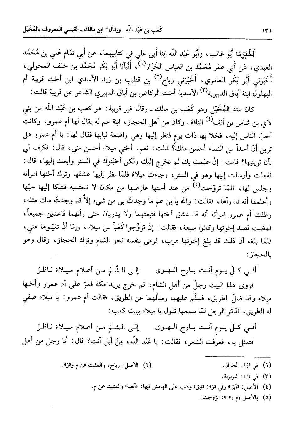 أخبرنا أبو غالب وأبو عبد الله ابنا أبي علي في كتابيهما عن أبي تمام علي بن محمد العبدي عن أبي عمر محمد بن العباس الخزاز (1) أنبأنا أبو بكر محمد بن خلف المحولي أخبرني أبو بكر العامري أخبرني رباح (2) بن قطيب بن زيد الأسدي ابن أخت قريبة أم البهلول ابنة أباق الدبيرية (3) الأسدية أخت الركاض بن أباق الدبيري الشاعر عن قريبة قالت كان عند المخبل وهو كعب بن مالك وقال غير قريبة هو كعب بن عبد الله من بني لاي بن شاس بن أنف (4) الناقة وكان من أهل الحجاز ابنة عم له يقال لها أم عمرو وكانت أحب الناس إليه فخلا بها ذات يوم فنظر إليها وهي واضعة ثيابها فقال لها يا أم عمرو هل ترين أن أحدا من النساء أحسن منك؟ قالت نعم أختي ميلاء أحسن مني قال فكيف لي بأن ترينيها؟ قالت إن علمت بك لم تخرج إليك ولكن أخبئوك في الستر وأبعث إليها قال: ففعلت وأرسلت إليها وهو في الستر وجاءت ميلاء فلما نظر إليها عشقها وترك أختها امرأته وجلس لها فلما تروحت (5) من عند أختها عارضها من مكان لا تحتسبه فشكا إليها حبها وأعلمها أنه قد رآها فقالت والله يا بن عم ما وجدت بي من شئ إلا قد وجدت منك مثله وظنت أم عمرو امرأته أنه قد عشق أختها فتبعتهما ولا يدريان حتى رأتهما قاعدين جميعا فمضت قصد إخوتها وكانوا سبعة فقالت إن تزوجوا كعبا من ميلاء وإما أن تغيبوها عني فلما بلغه أن ذلك قد بلغ إخوتها هرب فرمى بنفسه نحو الشام وترك الحجاز وقال وهو بالحجاز: أفي كل يوم أنت بارح الهوى * إلى الشم من أعلام ميلاء ناظر فروى هذا البيت رجل من أهل الشام ثم خرج يريد مكة فمر على أم عمرو وأختها ميلاء وقد ضل الطريق فسلم عليهما وسألهما عن الطريق فقالت أم عمرو يا ميلاء صفي له الطريق فذكر الرجل لما سمعها تقول يا ميلاء ببيت كعب: أفي كل يوم أنت بارح الهوى * إلى الشم من أعلام ميلاء ناظر فتمثل به فعرفت الشعر فقالت يا عبد الله من أين أنت قال أنا رجل من أهل