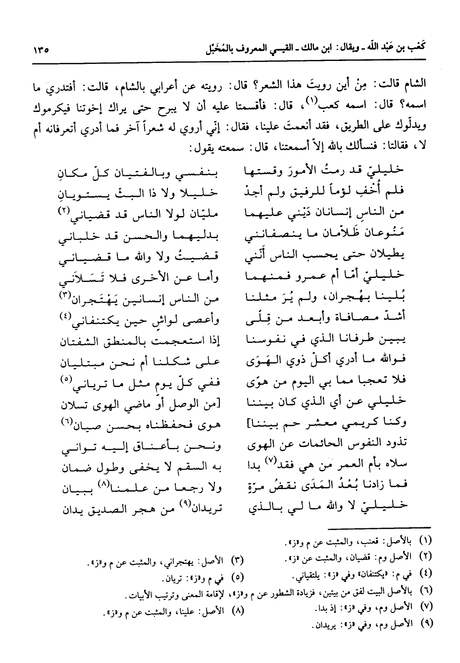 الشام قالت من أين رويت هذا الشعر قال رويته عن أعرابي بالشام قالت أفتدري ما اسمه قال اسمه كعب (1) قال فأقسمتا عليه أن لا يبرح حتى يراك إخوتنا فيكرموك ويدلوك على الطريق فقد أنعمت علينا فقال إني أروي له شعرا آخر فما أدري أتعرفانه أم لا فقالتا فنسألك بالله إلا أسمعتنا قال سمعته يقول: خليلي قد رمت الأمور وقستها * بنفسي وبالفتيان كل مكان فلم أخف لؤما للرفيق ولم أجد * خليلا ولا ذا البث يستويان من الناس إنسانان ديني عليهما * مليان لولا الناس قد قضياني (2) منوعان ظلامان ما ينصفانني * بدليهما والحسن قد خلباني يطيلان حتى يحسب الناس أنني * قضيت ولا والله ما قضياني خليلي أما أم عمرو فمنهما * وأما عن الأخرى فلا تسلاني بلينا بهجران ولم ير مثلنا * من الناس إنسانين يهتجران (3) أشد مصافاة وأبعد من قلى * وأعصى لواش حين يكتنفاني (4) يبين طرفانا الذي في نفوسنا * إذا استعجمت بالمنطق الشفتان فوالله ما أدري أكل ذوي الهوى * على شكلنا أم نحن مبتليان فلا تعجبا مما بي اليوم من هوى * ففي كل يوم مثل ما ترياني (5) خليلي عن أي الذي كان بيننا * من الوصل أو ماضي الهوى تسلان وكنا كريمي معشر حم بيننا * هوى فحفظناه بحسن صيان (6) تذود النفوس الحائمات عن الهوى * ونحن بأعناق إليه تواني سلاه بأم العمر من هي فقد (7) بدا * به السقم لا يخفى وطول ضمان فما زادنا بعد المدى نقض مرة * ولا رجعا من علمنا (8) ببيان خليلي لا والله ما لي بالذي * تريدان (9) من هجر الصديق يدان