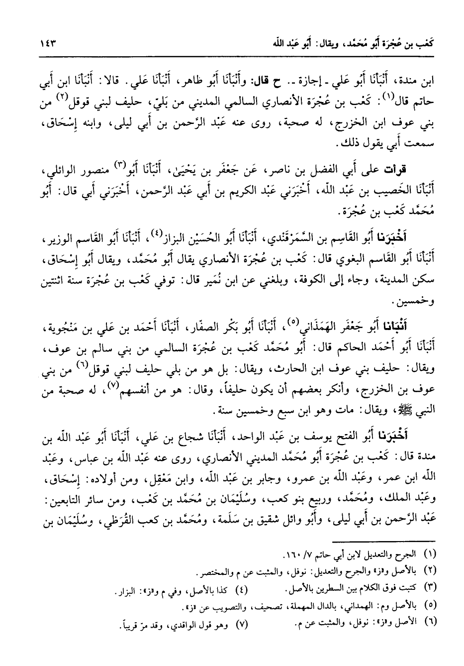 ابن مندة أنبانا أبو علي إجازة ح قال وأنبأنا أبو طاهر أنبانا علي قالا أنبأنا ابن أبي حاتم قال (1) كعب بن عجرة الأنصاري السالمي المديني من بلي حليف لبني قوقل (2) من بني عوف بن الخزرج له صحبة روى عنه عبد الرحمن بن أبي ليلى وابنه إسحاق سمعت أبي يقول ذلك قرأت على أبي الفضل بن ناصر عن جعفر بن يحيى أنبأنا أبو (3) منصور الوائلي أنبأنا الخصيب بن عبد الله أخبرني عبد الكريم بن أبي عبد الرحمن أخبرني أبي قال: أبو محمد كعب بن عجرة أخبرنا أبو القاسم بن السمرقندي أنبأنا أبو الحسين البزاز (4) أنبأنا أبو القاسم الوزير أنبأنا أبو القاسم البغوي قال كعب بن عجرة الأنصاري يقال أبو محمد ويقال أبو إسحاق سكن المدينة وجاء إلى الكوفة وبلغني عن ابن نمير قال توفي كعب بن عجرة سنة اثنتين وخمسين أنبأنا أبو جعفر الهمذاني (5) أنبأنا أبو بكر الصفار أنبأنا أحمد بن علي بن منجوية أنبأنا أبو أحمد الحاكم قال أبو محمد كعب بن عجرة السالمي من بني سالم بن عوف ويقال حليف بني عوف ابن الحارث ويقال بل هو من بلي حليف لبني قوقل (6) من بني عوف بن الخزرج وأنكر بعضهم أن يكون حليفا وقال هو من أنفسهم (7) له صحبة من النبي (صلى الله عليه وسلم) ويقال مات وهو ابن سبع وخمسين سنة أخبرنا أبو الفتح يوسف بن عبد الواحد أنبأنا شجاع بن علي أنبأنا أبو عبد الله بن مندة قال كعب بن عجرة أبو محمد المديني الأنصاري روى عنه عبد الله بن عباس وعبد الله بن عمر وعبد الله بن عمرو وجابر بن عبد الله وابن معقل ومن أولاده إسحاق وعبد الملك ومحمد وربيع بنو كعب وسليمان بن محمد بن كعب ومن سائر التابعين عبد الرحمن بن أبي ليلى وأبو وائل شقيق بن سلمة ومحمد بن كعب القرظي وسليمان بن