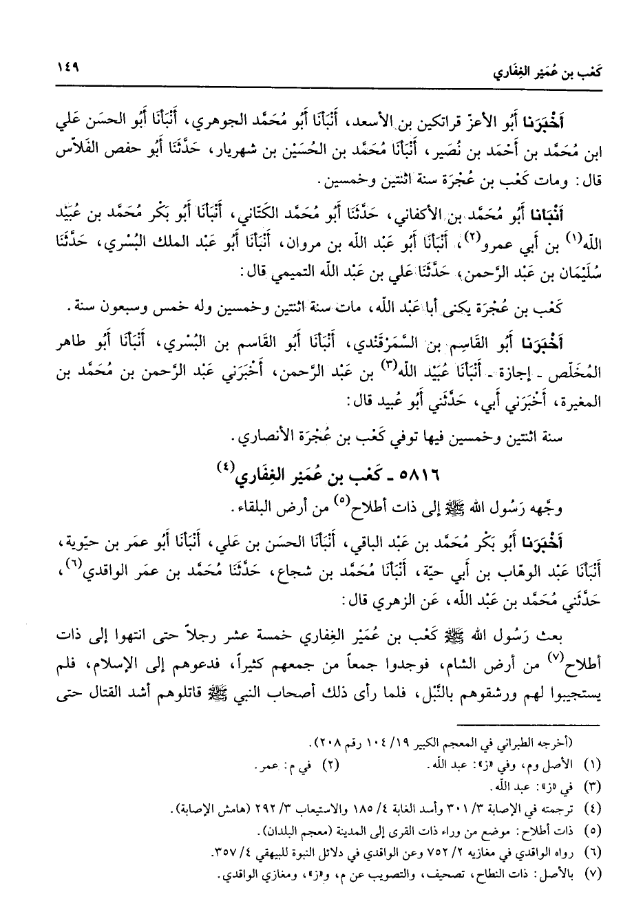 أخبرنا أبو الأعز قراتكين بن الأسعد أنبأنا أبو محمد الجوهري أنبأنا أبو الحسن علي بن محمد بن أحمد بن نصير أنبأنا محمد بن الحسين بن شهريار حدثنا أبو حفص الفلاس قال ومات كعب بن عجرة سنة اثنتين وخمسين أنبأنا أبو محمد بن الأكفاني حدثنا أبو محمد الكتاني أنبأنا أبو بكر محمد بن عبيد الله (1) بن أبي عمرو (2) أنبأنا أبو عبد الله بن مروان أنبأنا أبو عبد الملك البسري حدثنا سليمان بن عبد الرحمن حدثنا علي بن عبد الله التميمي قال كعب بن عجرة يكنى أبا عبد الله مات سنة اثنتين وخمسين وله خمس وسبعون سنة أخبرنا أبو القاسم بن السمرقندي أنبأنا أبو القاسم بن البسري أنبأنا أبو طاهر المخلص إجازة أنبأنا عبيد الله (3) بن عبد الرحمن أخبرني عبد الرحمن بن محمد بن المغيرة أخبرني أبي حدثني أبو عبيد قال سنة اثنتين وخمسين فيها توفي كعب بن عجرة الأنصاري 5816 - كعب بن عمير الغفاري (4) وجهه رسول الله (صلى الله عليه وسلم) إلى ذات أطلاح (5) من ارض البلقاء أخبرنا أبو بكر محمد بن عبد الباقي أنبأنا الحسن بن علي أنبأنا أبو عمر بن حيوية أنبأنا عبد الوهاب بن أبي حية أنبأنا محمد بن شجاع حدثنا محمد بن عمر الواقدي (6) حدثني محمد بن عبد الله عن الزهري قال بعث رسول الله (صلى الله عليه وسلم) كعب بن عمير الغفاري خمسة عشر رجلا حتى انتهوا إلى ذات أطلاح (7) من أرض الشام فوجدوا جمعا من جمعهم كثيرا فدعوهم إلى الإسلام فلم يستجيبوا لهم ورشقوهم بالنبل فلما رأى ذلك أصحاب النبي (صلى الله عليه وسلم) قاتلوهم أشد القتال حتى