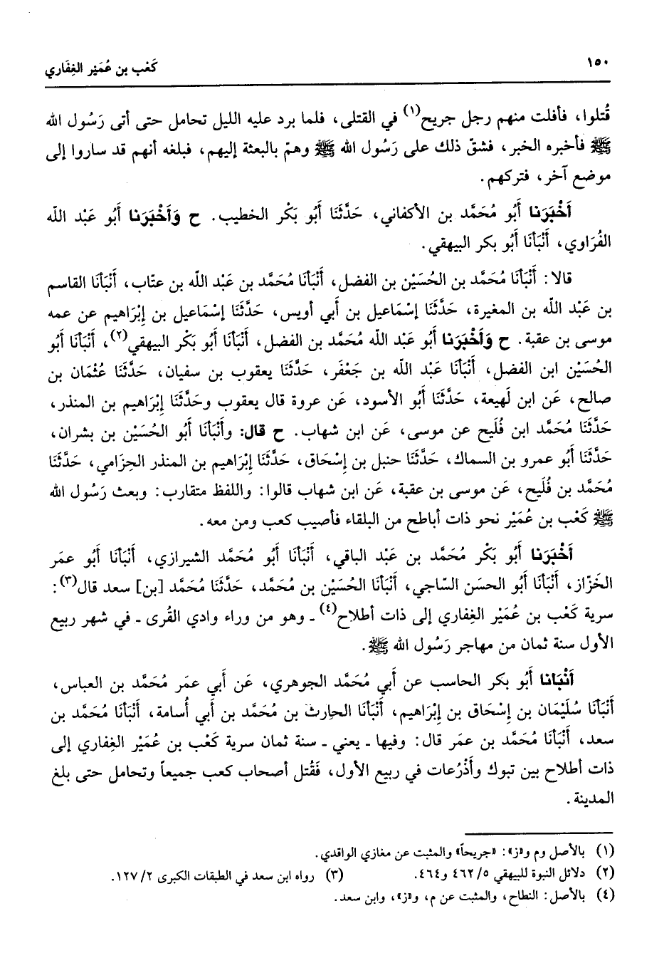 قتلوا فأفلت منهم رجل جريح (1) في القتلى فلما برد عليه الليل تحامل حتى أتى رسول الله (صلى الله عليه وسلم) فأخبره الخبر فشق ذلك على رسول الله (صلى الله عليه وسلم) وهم بالبعثة إليهم فبلغه أنهم قد ساروا إلى موضع آخر فتركهم أخبرنا أبو محمد بن الأكفاني حدثنا أبو بكر الخطيب ح وأخبرنا أبو عبد الله الفراوي أنبأنا أبو بكر البيهقي قالا أنبأنا محمد بن الحسين بن الفضل أنبأنا محمد بن عبد الله بن عتاب أنبأنا القاسم بن عبد الله بن المغيرة حدثنا إسماعيل بن أبي أوس حدثنا إسماعيل بن إبراهيم عن عمه موسى بن عقبة ح وأخبرنا أبو عبد الله محمد بن الفضل أنبأنا أبو بكر البيهقي (2) أنبأنا أبو الحسين بن الفضل أنبأنا عبد الله بن جعفر حدثنا يعقوب بن سفيان حدثنا عثمان بن صالح عن ابن لهيعة حدثنا أبو الأسود عن عروة قال يعقوب وحدثنا إبراهيم بن المنذر حدثنا محمد بن فليح عن موسى عن ابن شهاب ح قال وأنبأنا أبو الحسين بن بشران حدثنا أبو عمرو بن السماك حدثنا حنبل بن إسحاق حدثنا إبراهيم بن المنذر الحزامي حدثنا محمد بن فليح عن موسى بن عقبة عن ابن شهاب قالوا واللفظ متقارب وبعث رسول الله (صلى الله عليه وسلم) كعب بن عمير نحو ذات أباطح من البلقاء فأصيب كعب ومن معه أخبرنا أبو بكر محمد بن عبد الباقي أنبأنا أبو محمد الشيرازي أنبأنا أبو عمر الخزاز أنبأنا أبو الحسن الساجي أنبأنا الحسين بن محمد حدثنا محمد بن سعد قال (3) : سرية كعب بن عمير الغفاري إلى ذات أطلاح (4) وهو من وراء وادي القرى في شهر ربيع الأول سنة ثمان من مهاجر رسول الله (صلى الله عليه وسلم) أنبأنا أبو بكر الحاسب عن أبي محمد الجوهري عن أبي عمر محمد بن العباس أنبأنا سليمان بن إسحاق بن إبراهيم أنبأنا الحارث بن محمد بن أبي أسامة أنبأنا محمد بن سعد أنبأنا محمد بن عمر قال وفيها يعني سنة ثمان سرية كعب بن عمير الغفاري إلى ذات أطلاح بين تبوك وأذرعات في ربيع الأول فقتل أصحاب كعب جميعا وتحامل حتى بلغ المدينة