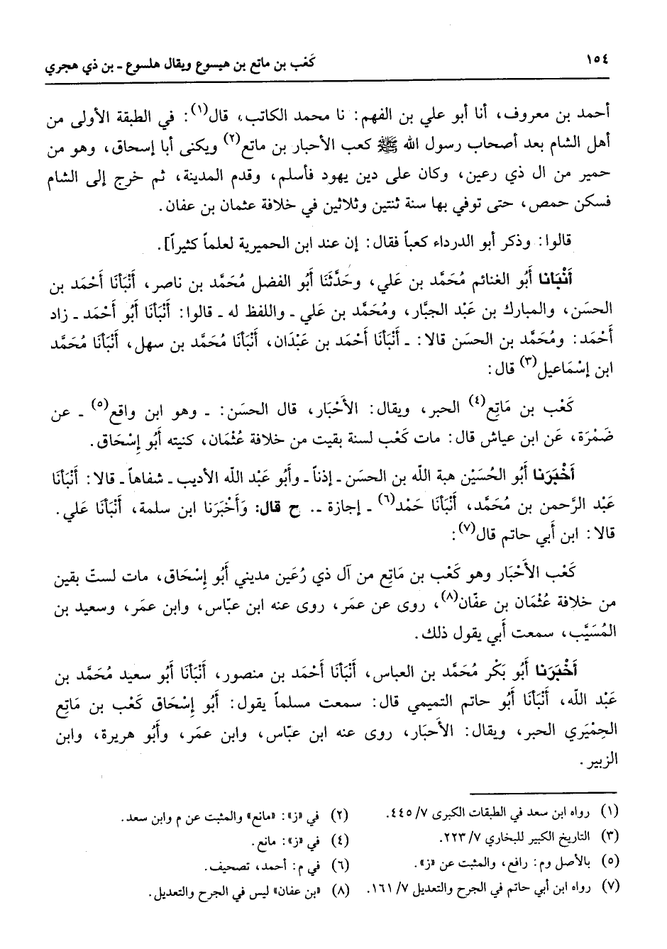 أحمد بن معروف أنا أبو علي بن الفهم نا محمد الكاتب قال (1) في الطبقة الأولى من أهل الشام بعد أصحاب رسول الله (صلى الله عليه وسلم) كعب الأحبار بن ماتع (2) ويكنى أبا إسحاق وهو من حمير من ال ذي رعين وكان على دين يهود فأسلم وقدم المدينة ثم خرج إلى الشام فسكن حمص حتى توفي بها سنة ثنتين وثلاثين في خلافة عثمان بن عفان قالوا وذكر أبو الدرداء كعبا فقال إن عند ابن الحميرية لعلما كثيرا أنبأنا أبو الغنائم محمد بن علي وحدثنا أبو الفضل محمد بن ناصر أنبأنا أحمد بن الحسن والمبارك بن عبد الجبار ومحمد بن علي واللفظ له قالوا أنبأنا أبو أحمد زاد أحمد ومحمد بن الحسن قالا أنبأنا أحمد بن عبدان أنبأنا محمد بن سهل أنبأنا محمد بن إسماعيل (3) قال كعب بن ماتع (4) الحبر ويقال الأحبار قال الحسن وهو ابن واقع (5) عن ضمرة عن ابن عياش قال مات كعب لسنة بقيت من خلافة عثمان كنيته أبو إسحاق أخبرنا أبو الحسين هبة الله بن الحسن إذنا وأبو عبد الله الأديب شفاها قالا أنبأنا عبد الرحمن بن محمد أنبأنا حمد (6) إجازة ح قال وأخبرنا ابن سلمة أنبأنا علي قالا ابن أبي حاتم قال (7) كعب الأحبار وهو كعب بن ماتع من آل ذي رعين مديني أبو إسحاق مات لست بقين من خلافة عثمان بن عفان (8) روى عن عمر روى عنه ابن عباس وابن عمر وسعيد بن المسيب سمعت أبي يقول ذلك أخبرنا أبو بكر محمد بن العباس أنبأنا أحمد بن منصور أنبأنا أبو سعيد محمد بن عبد الله أنبأنا أبو حاتم التميمي قال سمعت مسلما يقول أبو إسحاق كعب بن ماتع الحميري الحبر ويقال الأحبار روى عنه ابن عباس وابن عمر وأبو هريرة وابن الزبير