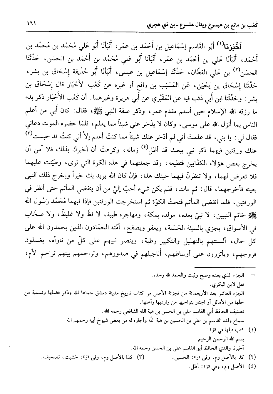 أخبرنا (1) أبو القاسم إسماعيل بن أحمد بن عمر أنبأنا أبو علي محمد بن محمد بن أحمد أنبانا علي بن أحمد بن عمر أنبانا أبو علي محمد بن أحمد بن الحسن حدثنا الحسن (2) بن علي القطان حدثنا إسماعيل بن عيسى أنبأنا أبو حذيفة إسحاق بن بشر حدثنا إسحاق بن يحيى عن المسيب بن رافع أو غيره عن كعب الأحبار قال إسحاق بن بشر وحدثنا ابن أبي ذئب فيه عن المقبري عن أبي هريرة وغيرهما أن كعب الأحبار ذكر بدء ما رزقه الله الإسلام حين أسلم مقدم عمر وذكر صفة النبي (صلى الله عليه وسلم) فقال كان أبي من أعلم الناس بما أنزل الله على موسى وكان لا يدخر عني شيئا مما يعلم فلما حضره الموت دعاني فقال لي يا بني قد علمت أني لم أدخر عنك شيئا مما كنت أعلم إلا أني كنت قد حبست (3) عنك ورقتين فيهما ذكر نبي يبعث قد أظل (4) زمانه وكرهت أن أخبرك بذلك فلا آمن أن يخرج بعض هؤلاء الكذابين فتطيعه وقد جعلتهما في هذه الكوة التي ترى وطينت عليهما فلا تعرض لهما ولا تنظرن فيهما حينك هذا فإن كان الله يريد بك خيرا ويخرج ذلك النبي بعينه فأخرجهما قال ثم مات فلم يكن شئ أحب إلي من أن ينقضي المأتم حتى أنظر في الورقتين فلما انقضى المأتم فتحت الكوة ثم استخرجت الورقتين فإذا فيهما محمد رسول الله (صلى الله عليه وسلم) خاتم النبيين لا نبي بعده مولده بمكة ومهاجره طيبة لا فظ ولا غليظ ولا صخاب في الأسواق يجزي بالسيئة الحسنة ويعفو ويصفح أمته الحمادون الذين يحمدون الله على كل حال ألسنتهم بالتهليل والتكبير رطبة وينصر نبيهم على كل من ناوأه يغسلون فروجهم ويأتزرون على أوساطهم أناجيلهم في صدورهم وتراحمهم بينهم تراحم الأم