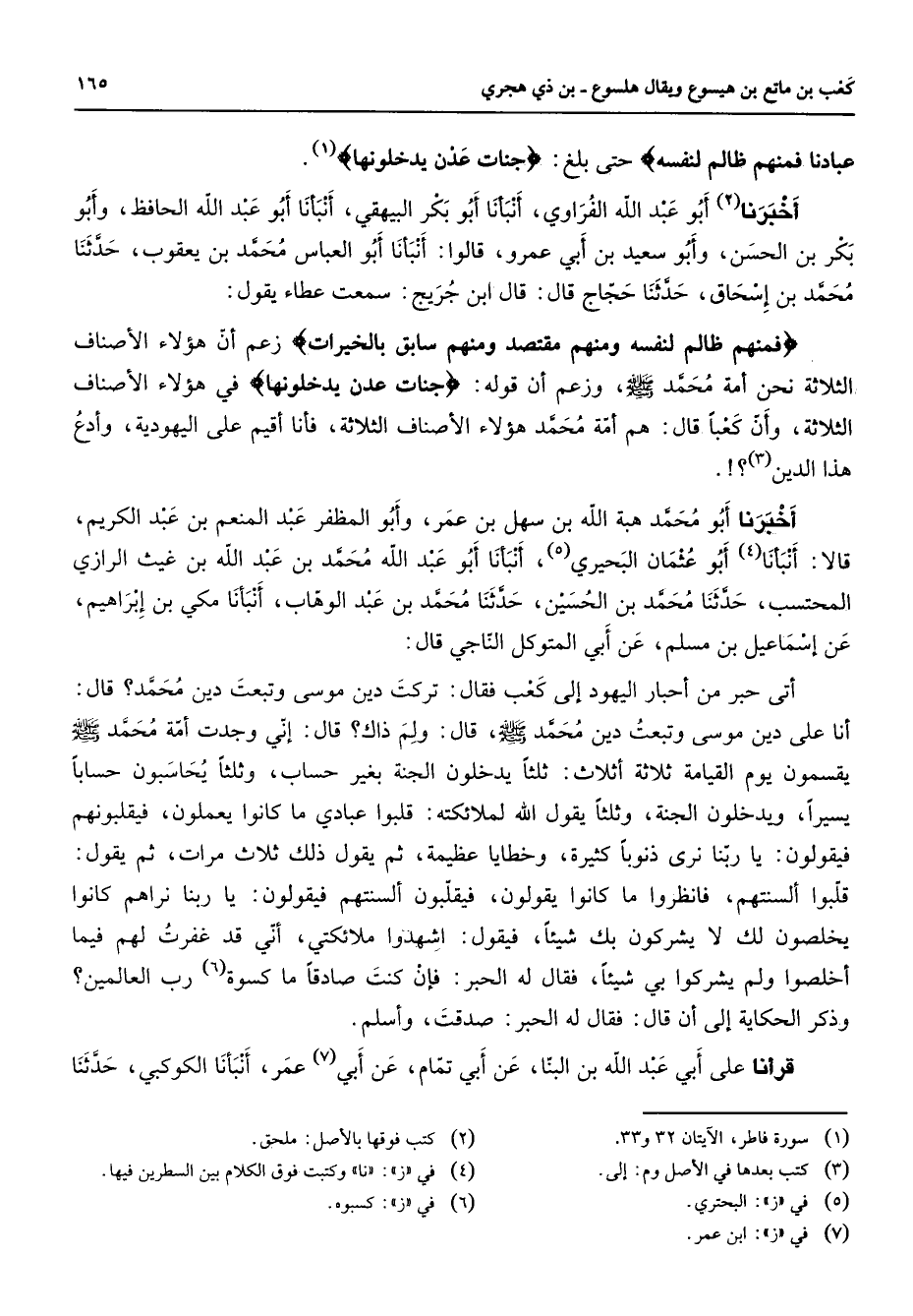 عبادنا فمنهم ظالم لنفسه " حتى بلغ " جنات عدن يدخلونها " (1) أخبرنا (2) أبو عبد الله الفراوي أنبأنا أبو بكر البيهقي أنبأنا أبو عبد الله الحافظ وأبو بكر بن الحسن وأبو سعيد بن أبي عمرو قالوا أنبأنا أبو العباس محمد بن يعقوب حدثنا محمد بن إسحاق حدثنا حجاج قال قال ابن جريج سمعت عطاء يقول: " فمنهم ظالم لنفسه ومنهم مقتصد ومنهم سابق بالخيرات " زعم أن هؤلاء الأصناف الثلاثة نحن أمة محمد (صلى الله عليه وسلم) وزعم أن قوله " جنات عدن يدخلونها " في هؤلاء الأصناف الثلاثة وأن كعبا قال هم أمة محمد هؤلاء الأصناف الثلاثة فأنا أقيم على اليهودية وأدع هذا الدين (3) أخبرنا أبو محمد هبة الله بن سهل بن عمر وأبو المظفر عبد المنعم بن عبد الكريم قالا أنبأنا (4) أبو عثمان البحيري (5) أنبأنا أبو عبد الله محمد بن عبد الله بن غيث الرازي المحتسب حدثنا محمد بن الحسين حدثنا محمد بن عبد الوهاب أنبأنا مكي بن إبراهيم عن إسماعيل بن مسلم عن أبي المتوكل الناجي قال أتى حبر من أحبار اليهود إلى كعب فقال تركت دين موسى وتبعت دين محمد قال أنا على دين موسى وتبعت دين محمد (صلى الله عليه وسلم) قال ولم ذاك قال إني وجدت أمة محمد (صلى الله عليه وسلم) يقسمون يوم القيامة ثلاثة أثلاث ثلثا يدخلون الجنة بغير حساب وثلثا يحاسبون حسابا يسيرا ويدخلون الجنة وثلثا يقول الله لملائكته قلبوا عبادي ما كانوا يعملون فيقلبونهم فيقولون يا ربنا نرى ذنوبا كثيرة وخطايا عظيمة ثم يقول ذلك ثلاث مرات ثم يقول قلبوا ألسنتهم فانظروا ما كانوا يقولون فيقلبون ألسنتهم فيقولون يا ربنا نراهم كانوا يخلصون لك لا يشركون بك شيئا فيقول اشهدوا ملائكتي أني قد غفرت لهم فيما أخلصوا ولم يشركوا بي شيئا فقال له الحبر فإن كنت صادقا ما كسوة (6) رب العالمين وذكر الحكاية إلى أن قال فقال له الحبر صدقت وأسلم قرأت على أبي عبد الله بن البنا عن أبي (7) تمام عن أبي عمر أنبأنا الكوكبي حدثنا