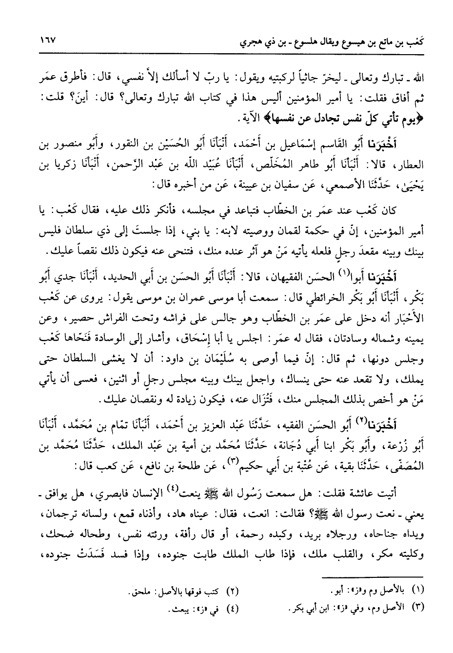 الله تبارك وتعالى ليخر جاثيا لركبتيه ويقول يا رب لا أسألك إلا نفسي قال فأطرق عمر ثم أفاق فقلت يا أمير المؤمنين أليس هذا في كتاب الله تبارك وتعالى قال أين قلت: " يوم تأتي كل نفس تجادل عن نفسها " الآية أخبرنا أبو القاسم إسماعيل بن أحمد أنبأنا أبو الحسين بن النقور وأبو منصور بن العطار قالا أنبأنا أبو طاهر المخلص أنبأنا عبيد الله بن عبد الرحمن أنبأنا زكريا بن يحيى حدثنا الأصمعي عن سفيان بن عيينة عن من أخبره قال كان كعب عند عمر بن الخطاب فتباعد في مجلسه فأنكر ذلك عليه فقال كعب يا أمير المؤمنين إن في حكمة لقمان ووصيته لابنه يا بني إذا جلست إلى ذي سلطان فليس بينك وبينه مقعد رجل فلعله يأتيه من هو آثر عنده منك فتنحى عنه فيكون ذلك نقصا عليك أخبرنا أبوا (1) الحسن الفقيهان قالا أنبأنا أبو الحسن بن أبي الحديد أنبأنا جدي أبو بكر أنبأنا أبو بكر الخرائطي قال سمعت أبا موسى عمران بن موسى يقول يروى عن كعب الأحبار أنه دخل على عمر بن الخطاب وهو جالس على فراشه وتحت الفراش حصير وعن يمينه وشماله وسادتان فقال له عمر اجلس يا أبا إسحاق وأشار إلى الوسادة فنحاها كعب وجلس دونها ثم قال إن فيما أوصى به سليمان بن داود أن لا يغشى السلطان حتى يملك ولا تقعد عنه حتى ينساك واجعل بينك وبينه مجلس رجل أو اثنين فعسى أن يأتي من هو أخص بذلك المجلس منك فتزال عنه فيكون زيادة له ونقصان عليك أخبرنا (2) أبو الحسن الفقيه حدثنا عبد العزيز بن أحمد أنبأنا تمام بن محمد أنبأنا أبو زرعة وأبو بكر ابنا أبي دجانة حدثنا محمد بن أمية بن عبد الملك حدثنا محمد بن المصفى حدثنا بقية عن عتبة بن أبي حكيم (3) عن طلحة بن نافع عن كعب قال أتيت عائشة فقلت هل سمعت رسول الله (صلى الله عليه وسلم) ينعت (4) الإنسان فابصري هل يوافق يعني نعت رسول الله (صلى الله عليه وسلم) فقالت انعت فقال عيناه هاد وأذناه قمع ولسانه ترجمان ويداه جناحاه ورجلاه بريد وكبده رحمة أو قال رأفة ورئته نفس وطحالة ضحك وكليته مكر والقلب ملك فإذا طاب الملك طابت جنوده وإذا فسد فسدت جنوده