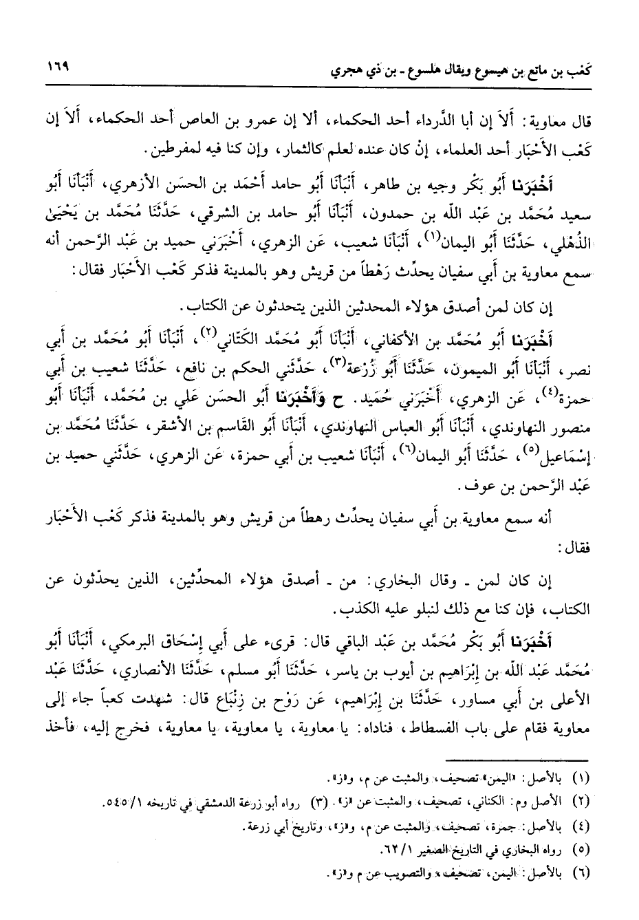 قال معاوية ألا إن أبا الدرداء أحد الحكماء ألا إن عمرو بن العاص أحد الحكماء ألا إن كعب الأحبار أحد العلماء إن كان عنده لعلم كالثمار وإن كنا فيه لمفرطين أخبرنا أبو بكر وجيه بن طاهر أنبأنا أبو حامد أحمد بن الحسن الأزهري أنبأنا أبو سعيد محمد بن عبد الله بن حمدون أنبأنا أبو حامد بن الشرقي حدثنا محمد بن يحيى الذهلي حدثنا أبو اليمان (1) أنبأنا شعيب عن الزهري أخبرني حميد بن عبد الرحمن أنه سمع معاوية بن أبي سفيان يحدث رهطا من قريش وهو بالمدينة فذكر كعب الأحبار فقال إن كان لمن أصدق هؤلاء المحدثين الذين يتحدثون عن الكتاب أخبرنا أبو محمد بن الأكفاني أنبأنا أبو محمد الكتاني (2) أنبأنا أبو محمد بن أبي نصر أنبأنا أبو الميمون حدثنا أبو زرعة (3) حدثني الحكم بن نافع حدثنا شعيب بن أبي حمزة (4) عن الزهري أخبرني حميد ح وأخبرنا أبو الحسن علي بن محمد أنبأنا أبو منصور النهاوندي أنبأنا أبو العباس النهاوندي أنبأنا أبو القاسم بن الأشقر حدثنا محمد بن إسماعيل (5) حدثنا أبو اليمان (6) أنبأنا شعيب بن أبي حمزة عن الزهري حدثني حميد بن عبد الرحمن بن عوف أنه سمع معاوية بن أبي سفيان يحدث رهطا من قريش وهو بالمدينة فذكر كعب الأحبار فقال إن كان لمن وقال البخاري من أصدق هؤلاء المحدثين الذين يحدثون عن الكتاب فإن كنا مع ذلك لنبلو عليه الكذب أخبرنا أبو بكر محمد بن عبد الباقي قال قرئ على أبي إسحاق البرمكي أنبأنا أبو محمد عبد الله بن إبراهيم بن أيوب بن ياسر حدثنا أبو مسلم حدثنا الأنصاري حدثنا عبد الأعلى بن أبي مساور حدثنا بن إبراهيم عن روح بن زنباع قال شهدت كعبا جاء إلى معاوية فقام على باب الفسطاط فناداه يا معاوية يا معاوية يا معاوية فخرج إليه فأخذ