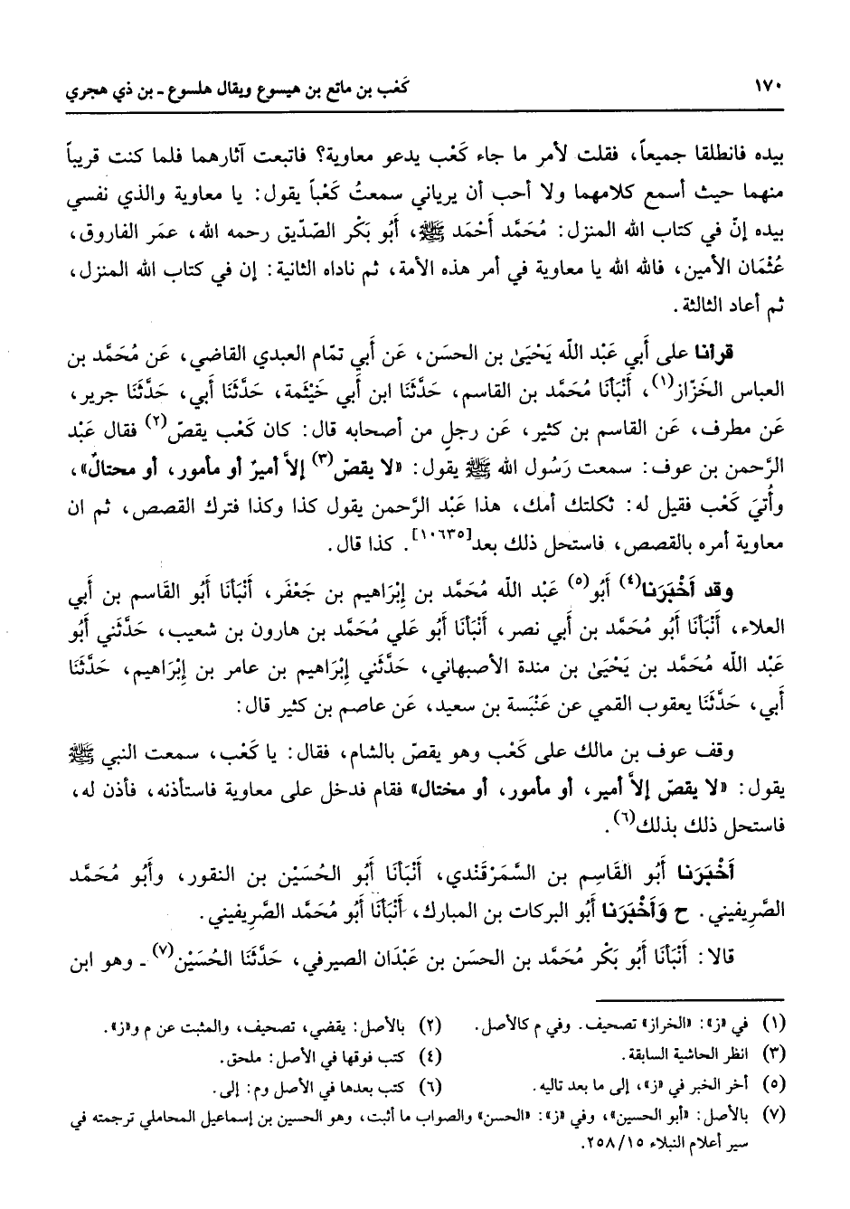 وقد أخبرنا (4) أبو (5) عبد الله محمد بن إبراهيم بن جعفر أنبأنا أبو القاسم بن أبي العلاء أنبأنا أبو محمد بن أبي نصر أنبأنا أبو علي محمد بن هارون بن شعيب حدثني أبو عبد الله محمد بن يحيى بن مندة الأصبهاني حدثني إبراهيم بن عامر بن إبراهيم حدثنا أبي حدثنا يعقوب القمي عن عنبسة بن سعيد عن عاصم بن كثير قال وقف عوف بن مالك على كعب وهو يقص بالشام فقال يا كعب سمعت النبي (صلى الله عليه وسلم) يقول لا يقص إلا أمير أو مأمور أو مختال فقام فدخل على معاوية فاستأذنه فأذن له فاستحل ذلك بذلك (6) أخبرنا أبو القاسم بن السمرقندي أنبأنا أبو الحسين بن النقور وأبو محمد الصريفيني ح وأخبرنا أبو البركات بن المبارك أنبأنا أبو محمد الصريفيني قالا أنبأنا أبو بكر محمد بن الحسن بن عبدان الصيرفي حدثنا الحسين (7) وهو ابن