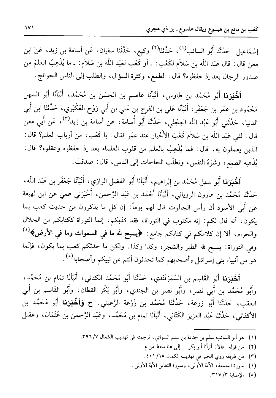 إسماعيل حدثنا أبو السائب (1) حدثنا (2) كيع حدثنا سفيان عن أسامة بن زيد عن ابن معن قال قال عبد الله بن سلام لكعب أو كعب لعبد الله بن سلام ما يذهب العلم من صدور الرجال بعد أن حفظوه قال الطمع وكثرة السؤال والطلب إلى الناس الحوائج أخبرنا أبو محمد بن طاوس أنبأنا عاصم بن الحسن بن محمد أنبأنا أبو السهل محمود بن عمر بن جعفر أنبأنا علي بن الفرج بن علي بن أبي روح العكبري حدثنا ابن أبي الدنيا حدثني أبو عبد الله العجلي حدثنا أبو أسامة عن أسامة بن زيد (3) عن أبي معن قال لقي عبد الله بن سلام كعب الأحبار عند عمر فقال يا كعب من أرباب العلم قال الذين يعملون به قال فما يذهب بالعلم من قلوب العلماء بعد إذ حفظوه وعقلوه قال يذهبه الطمع وشره النفس وتطلب الحاجات إلى الناس قال صدقت أخبرنا أبو سهل محمد بن إبراهيم أنبأنا أبو الفضل الرازي أنبأنا جعفر بن عبد الله حدثنا محمد بن هارون الروياني أنبأنا أحمد بن عبد الرحمن أخبرني عمي عن ابن لهيعة عن أبي الأسود أن رأس الجالوت قال لهم يوما إن كل ما يذكرون من حديث كعب بما يكون أنه قال لكم إنه مكتوب في التوراة فقد كذبكم إنما التوراة ككتابكم من الحلال والحرام ألا إن كلامكم في كتابكم جامع " يسبح لله ما في السموت وما في الأرض " (4) وفي التوراة يسبح لله الطير والشجر وكذا وكذا ولكن ما حدثكم كعب بما يكون فإنما هو من أنبياء بني إسرائيل وأصحابهم كما تحدثون أنتم عن نبيكم وأصحابه 5) أخبرنا أبو القاسم بن السمرقندي حدثنا أبو محمد الكتاني أنبأنا تمام بن محمد وأبو محمد بن أبي نصر وأبو نصر بن الجندي وأبو بكر القطان وأبو القاسم بن أبي العقب حدثنا أبو زرعة حدثنا محمد بن زرعة الرعيني ح وأخبرنا أبو محمد بن الأكفاني حدثنا عبد العزيز الكتاني أنبأنا تمام بن محمد وعبد الرحمن بن عثمان وعقيل